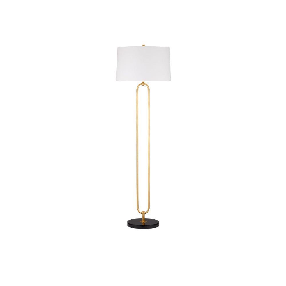 The oblong open-form body of the Glossary Floor Lamp is made of metal in a contemporary gold leaf finish. Clarence Mallari designed the gold floor lamp to look like a giant paper clip that rises above a black marble base. This contemporary design will be a perfect choice for a space needing stylish yet unobtrusive elements. The Glossary is topped with an off-white linen shade.