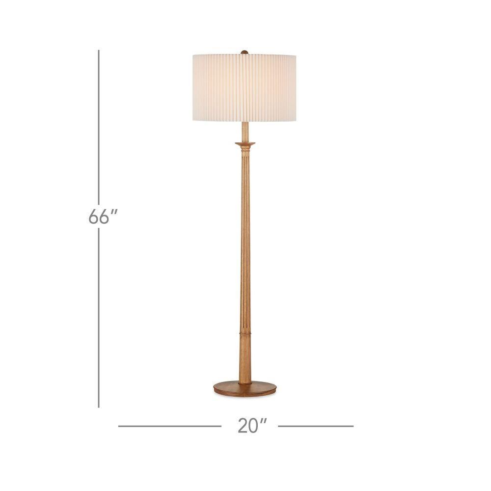 Made from turned wood, the Mitford Floor Lamp has a classic profile that was inspired by a traditional column design. Tom Caldwell envisioned the tan floor lamp with its refined Italian feel. By topping the thin floor lamp with a knife-pleated bone linen shade, he echoed the delineations in the wood lamp's body and made a wonderfully textural accent piece for an interior.