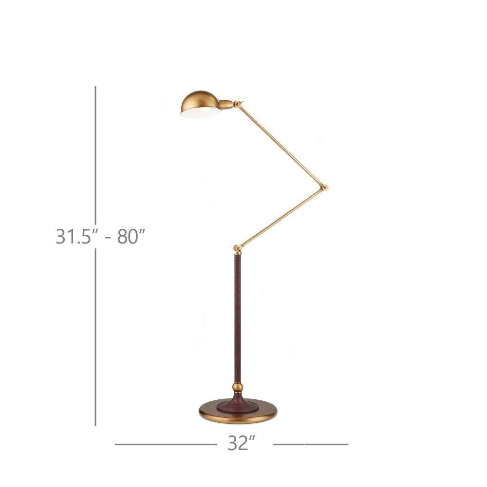The Libretto Floor Lamp is a clever design with ratcheted joints at three points to make it a reader's perfect companion. The metal parts in a gleaming antique brass finish contrast the warmth of the rust-colored faux leather that is woven around the bottom of the stem and the fluted detail on the base.