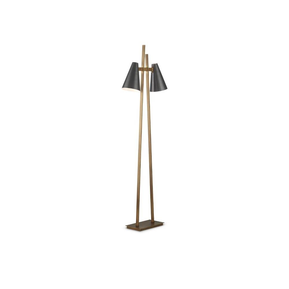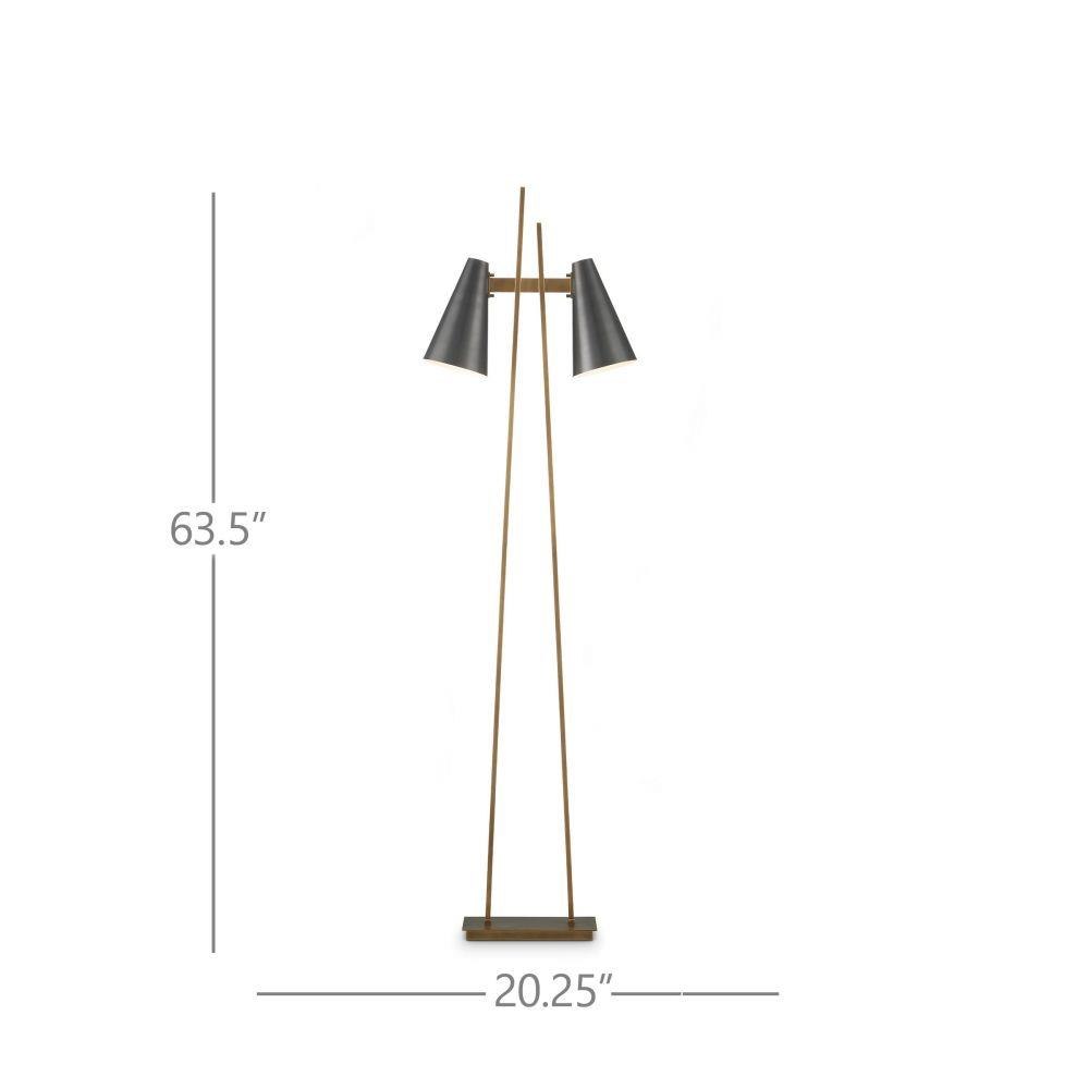 The Duet Floor Lamp has a pair of shades are aimed to give two readers the perfect amount of light when the lamp placed between two chairs. A design detail of note is the asymmetry of the two metal bars that rise up from the base, all in an antique brass finish. The contrasting fixed shades, in an oil-rubbed bronze finish, have white interiors for a brighter glow.