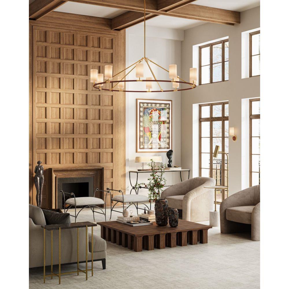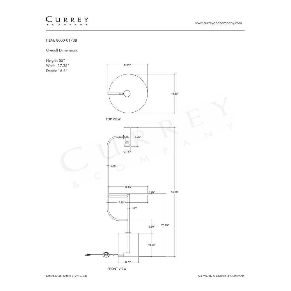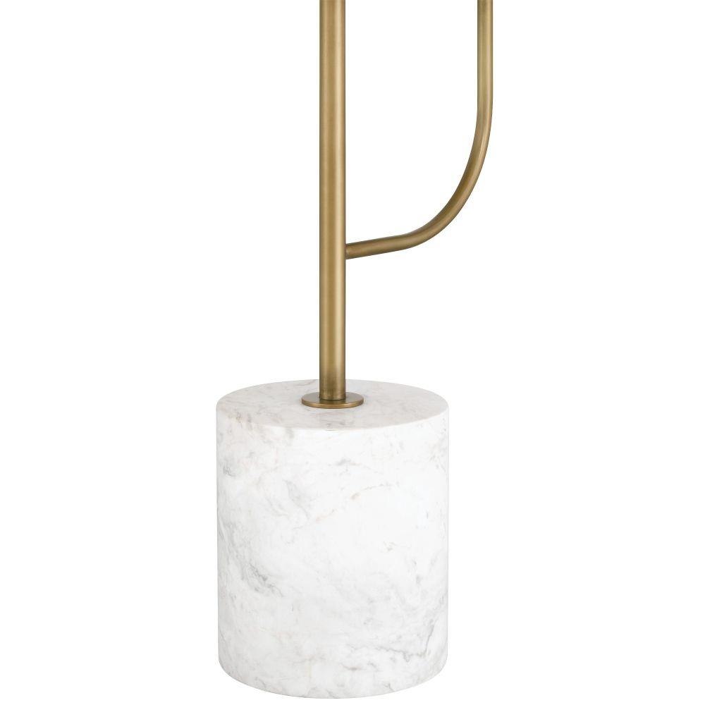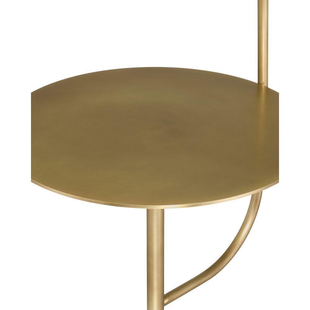 The Currey & Company Eastlin Floor Lamp/Table has a heavy cylindrical white marble base from which brass shapes rise.