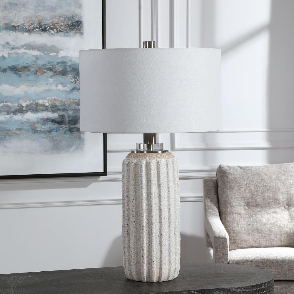 A Nod To Old World Style, This Ceramic Table Lamp Features A Distressed Cream And Beige Crackle Glaze With A Deep Ribbed Texture, Accented By Brushed Nickel And Crystal Details. A White Linen Fabric Drum Shade Completes The Look.