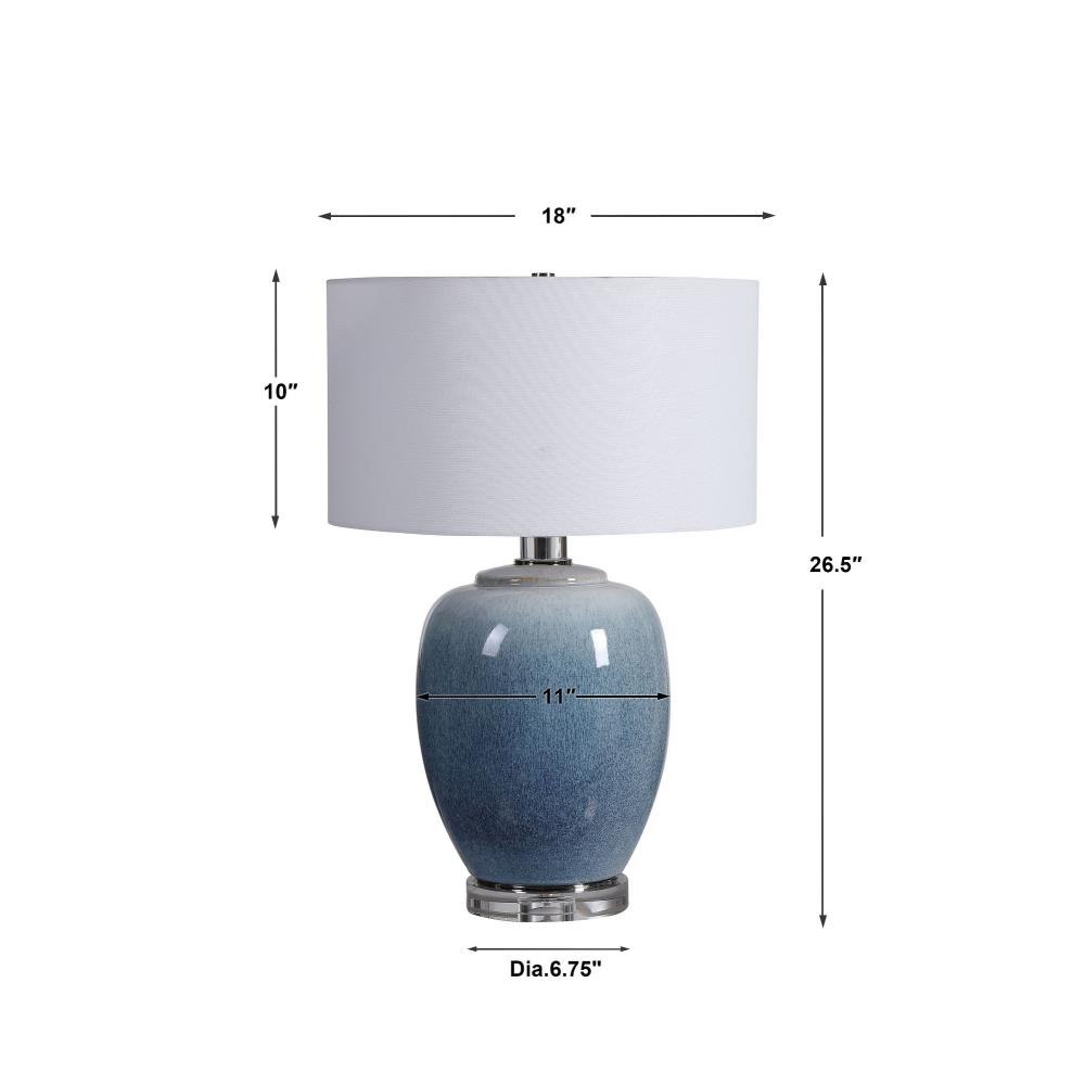 Ceramic Table Lamp Showcases Vibrant Shades Of Cobalt And Aqua That Transition Into A Subtle Ombre Toned Light Blue. Polished Nickel Details And Crystal Accents Create An Elegant And Sophisticated Look. A Crisp White Linen Drum Shade Accents The Piece.