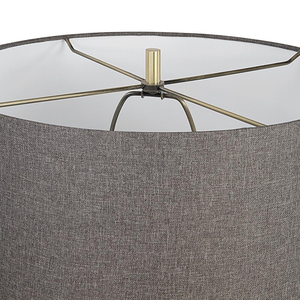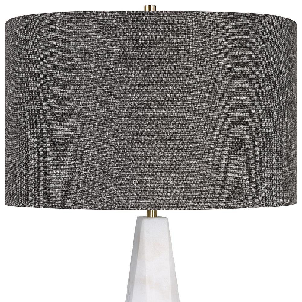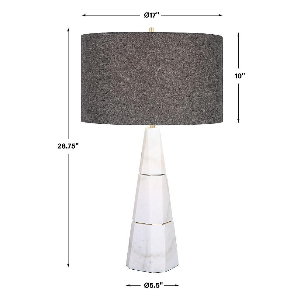 Modern Yet Classic, This Table Lamp Displays An Elegant White Honed Marble Base With Natural Gray Veining And Metal Accents Finished In Antique Brass. A Charcoal Gray Drum Shade Complements The Piece.