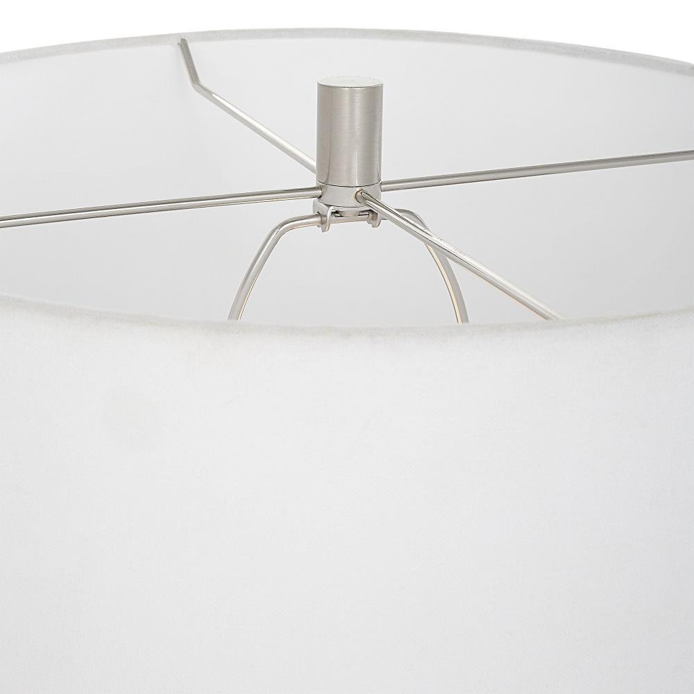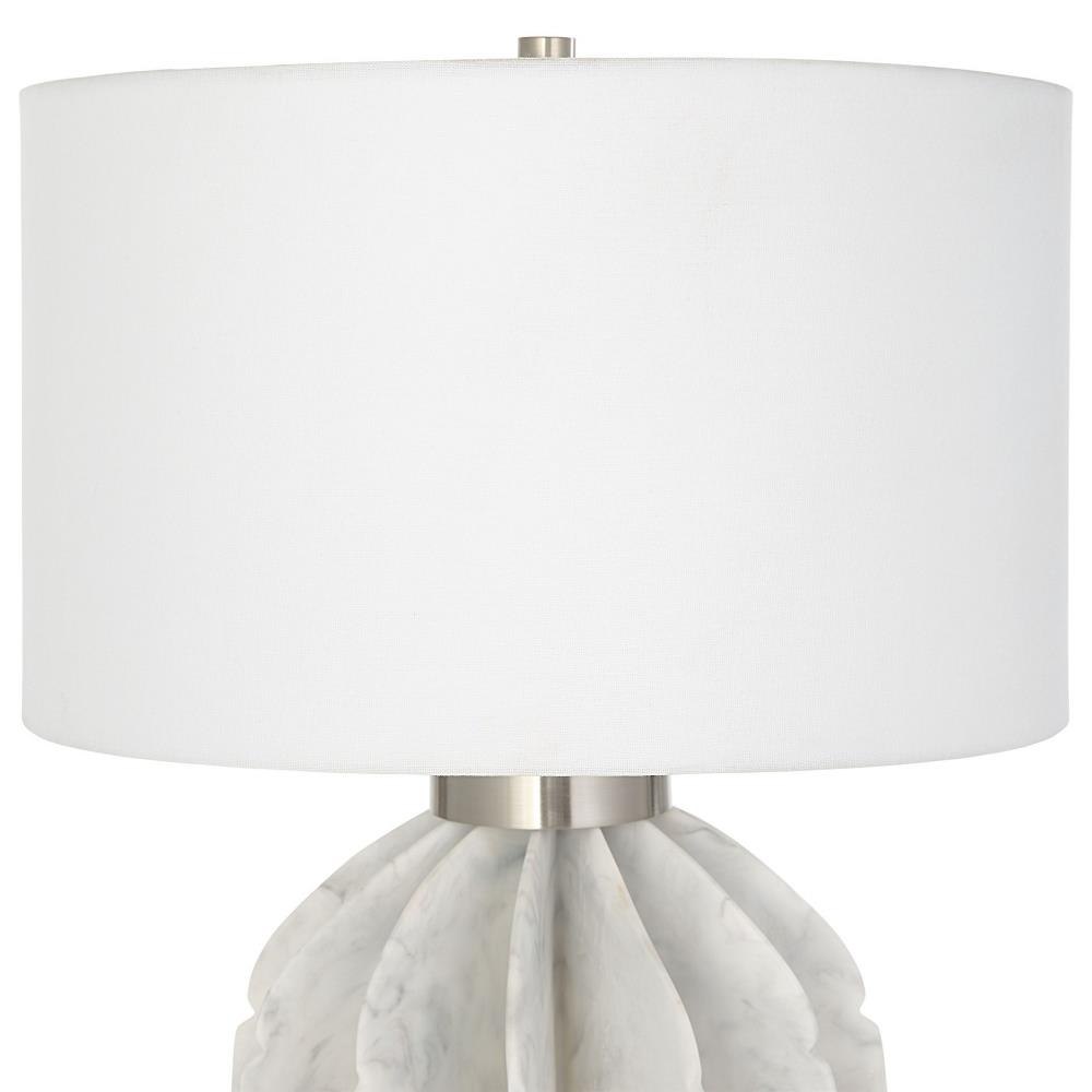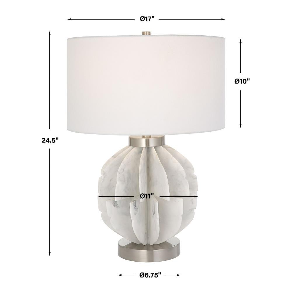 This Contemporary Table Lamp Features Thin Stacked Blades That Create An Organic Sphere Finished In A White Marble Look Accented By Plated Brushed Nickel Accents. The Lamp Is Paired With A White Fabric Drum Shade.