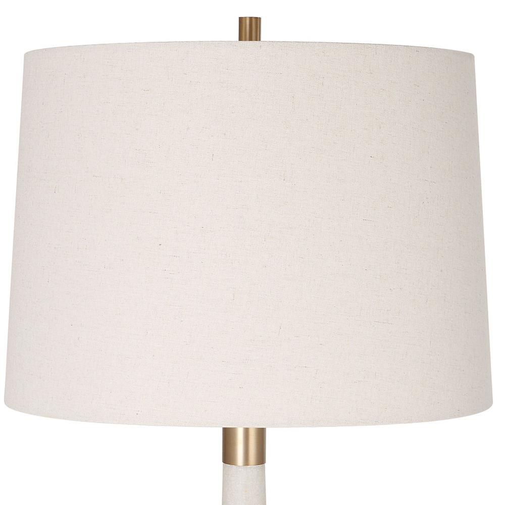 This Table Lamp Adds An Air Of Elegance And Sophistication To Any Space. The Body Of The Lamp Is Crafted From Ivory Man-made Stone That Accurately Replicates The Look Of Thassos Marble And Is Accented By Iron Details Finished In Brushed Brass. The Tapered Hardback Drum Shade Is Covered In A Casual Light Khaki Fabric With Natural Slubbing.