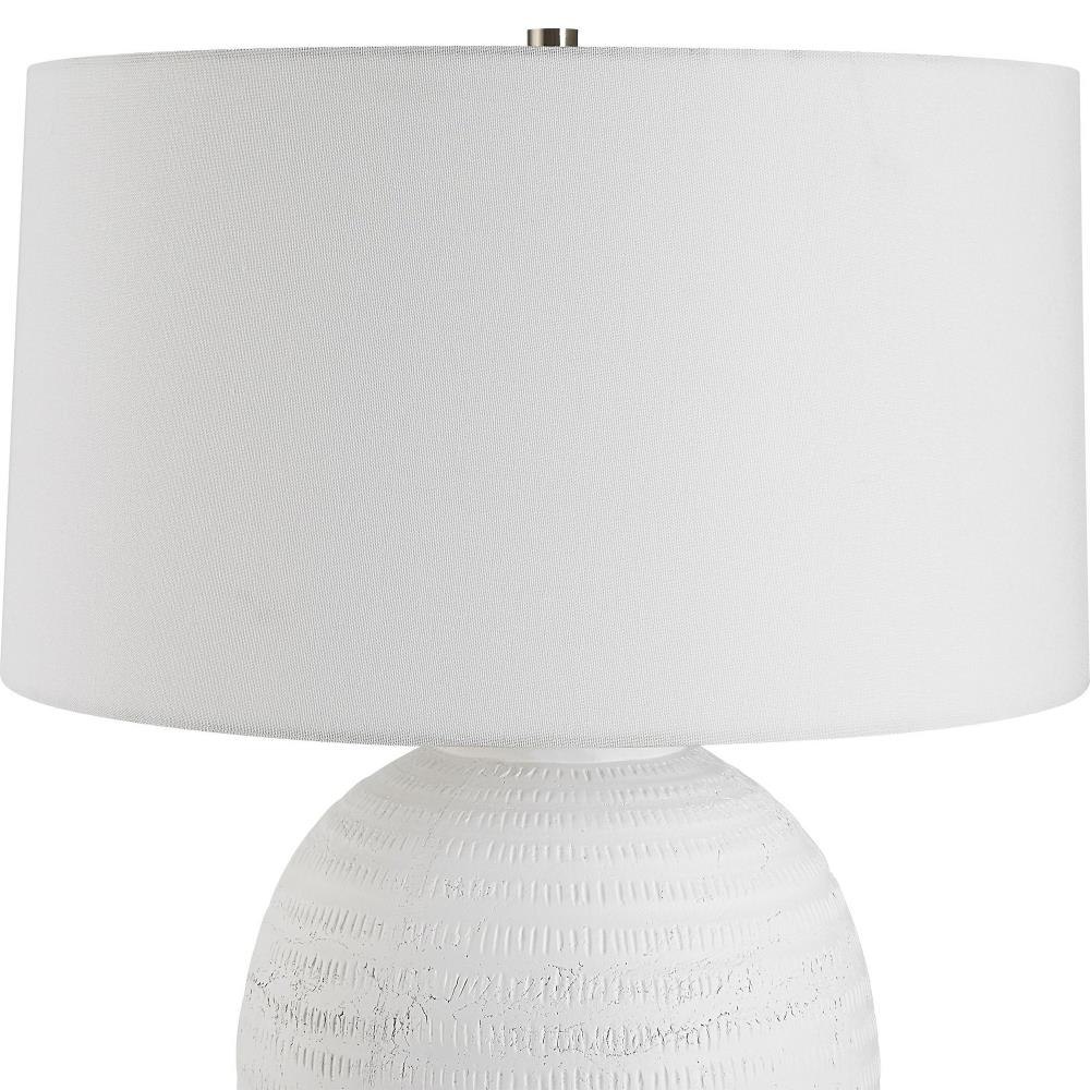 This Ceramic Table Lamp Features A Timeless Urn Shape Finished In A Chalk White Glaze With Updated Hand Carved Texture And Subtle Distressing, Accented With Brushed Nickel Details. The Slightly Tapered Large Round Shade Is Made In A Casual White Linen Fabric.