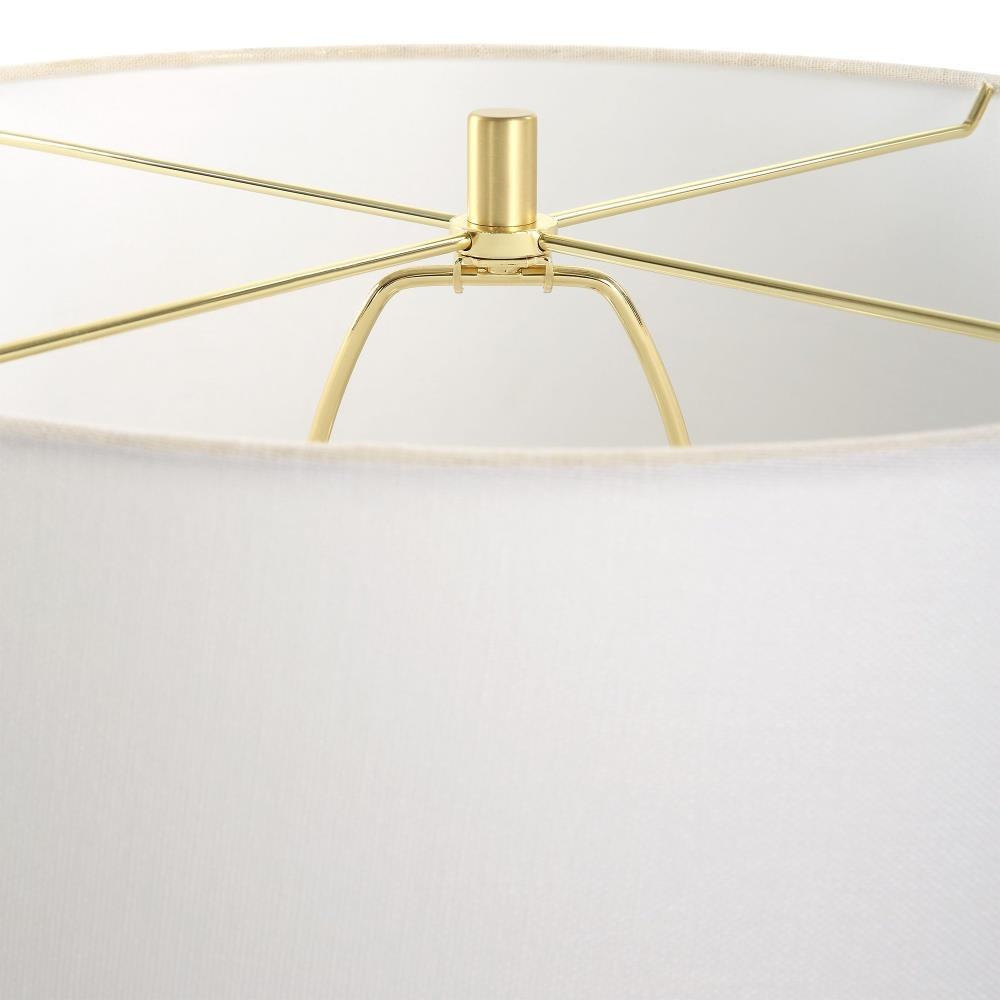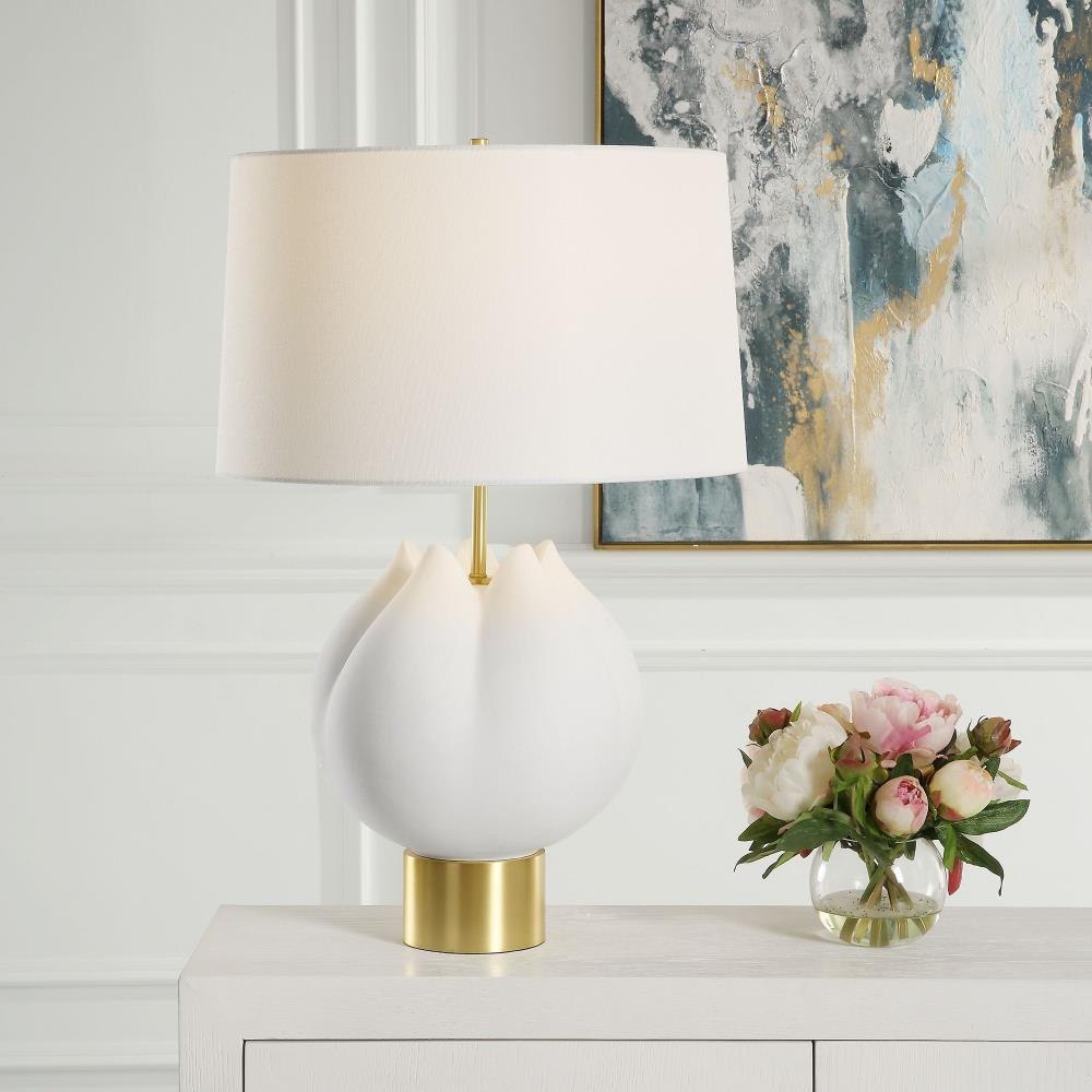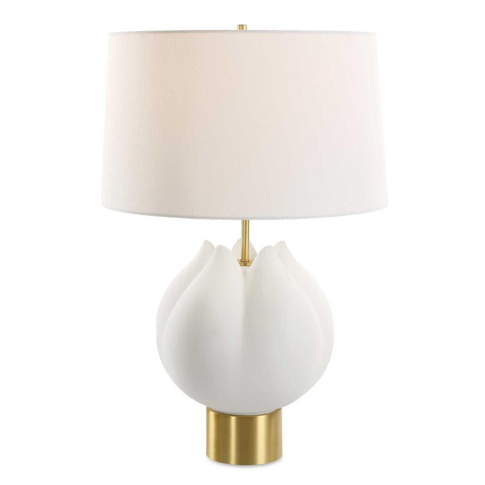 Inspired By Budding Flowers, The In Bloom Table Lamp Features A Porcelain Body With Subtle Texture, Finished In A Chalk White Glaze Paired With Lightly Antiqued Brass Plated Details. The Tapered Round Hardback Shade Completes The Piece In A Casual White Linen Fabric.