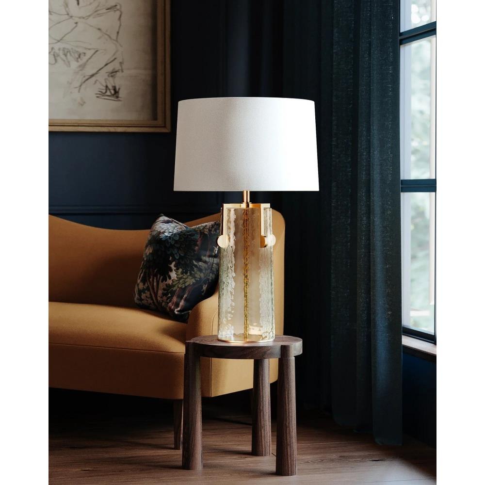 Taking inspiration from bespoke hardware details found on high end furniture, Wildwood makes a statement that is equal parts tailored and poetic. A smoky ombre glass base provides the perfect amount of transparency to appreciate the clean lines and circular forms of the Aged Brass metalwork. A large white linen drum shade balances the ethereal quality of this statement lamp.
