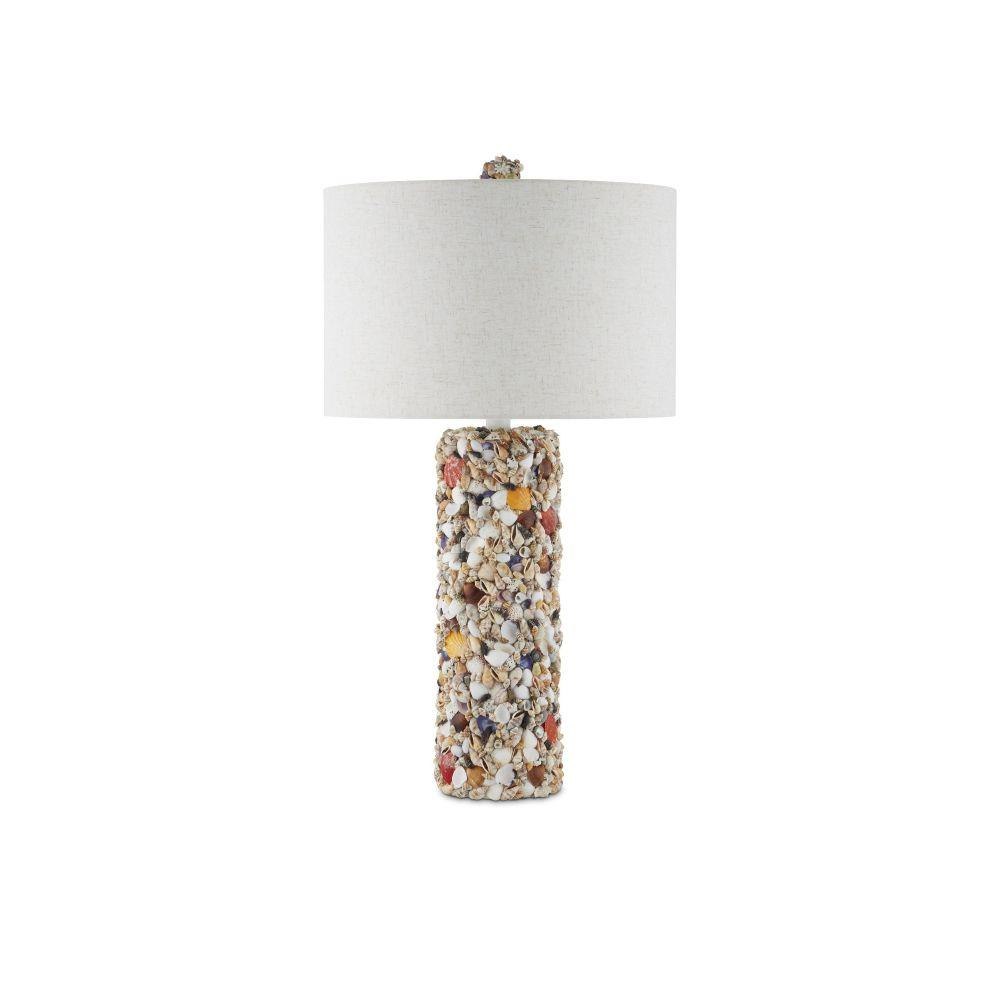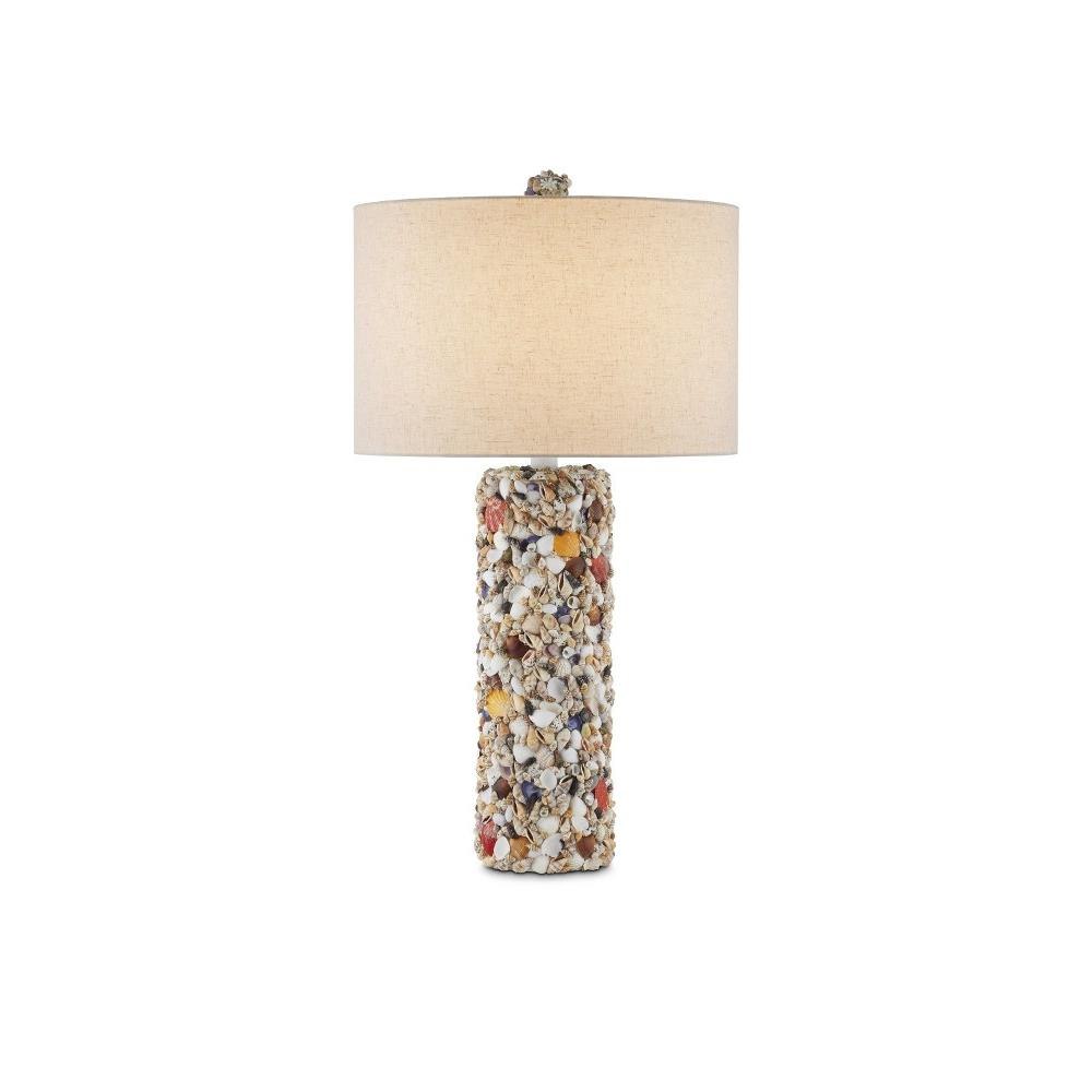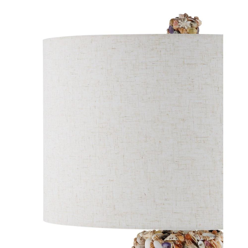 As its name implies, the tall columnar body of the Festoon Table Lamp is adorned with assorted seashells in an array of colors and shapes that have been sprinkled artfully along its surface. The hardware in a sugar white finish matches the palest ark and auger shells, and the ivory drum shade draws out the beige speckles in the tiny scallop shells. A fun detail on this lamp is the shell-encrusted finial.