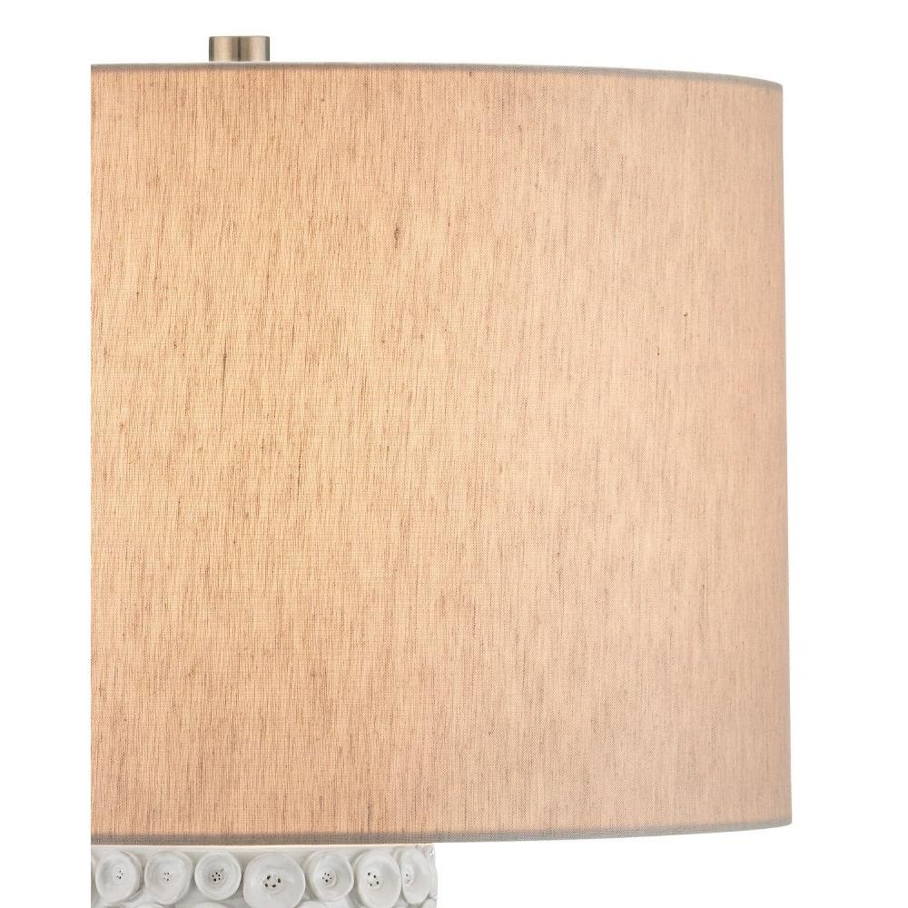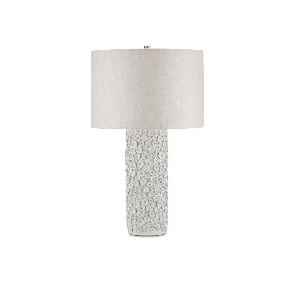 A fanciful creation, the Buttons Table Lamp earns its name given the body of the white lamp is covered with hand-applied, button-like circlets. The ornamentations are made of ceramic, as is the lamp’s body. The columnar fixture and its adornments are glazed in a crisp white once they have been applied. The painstaking attention to detail that is required to create such a varied but balanced pattern is achieved by a talented group of women artisans who live at the border of Burma and Thailand.