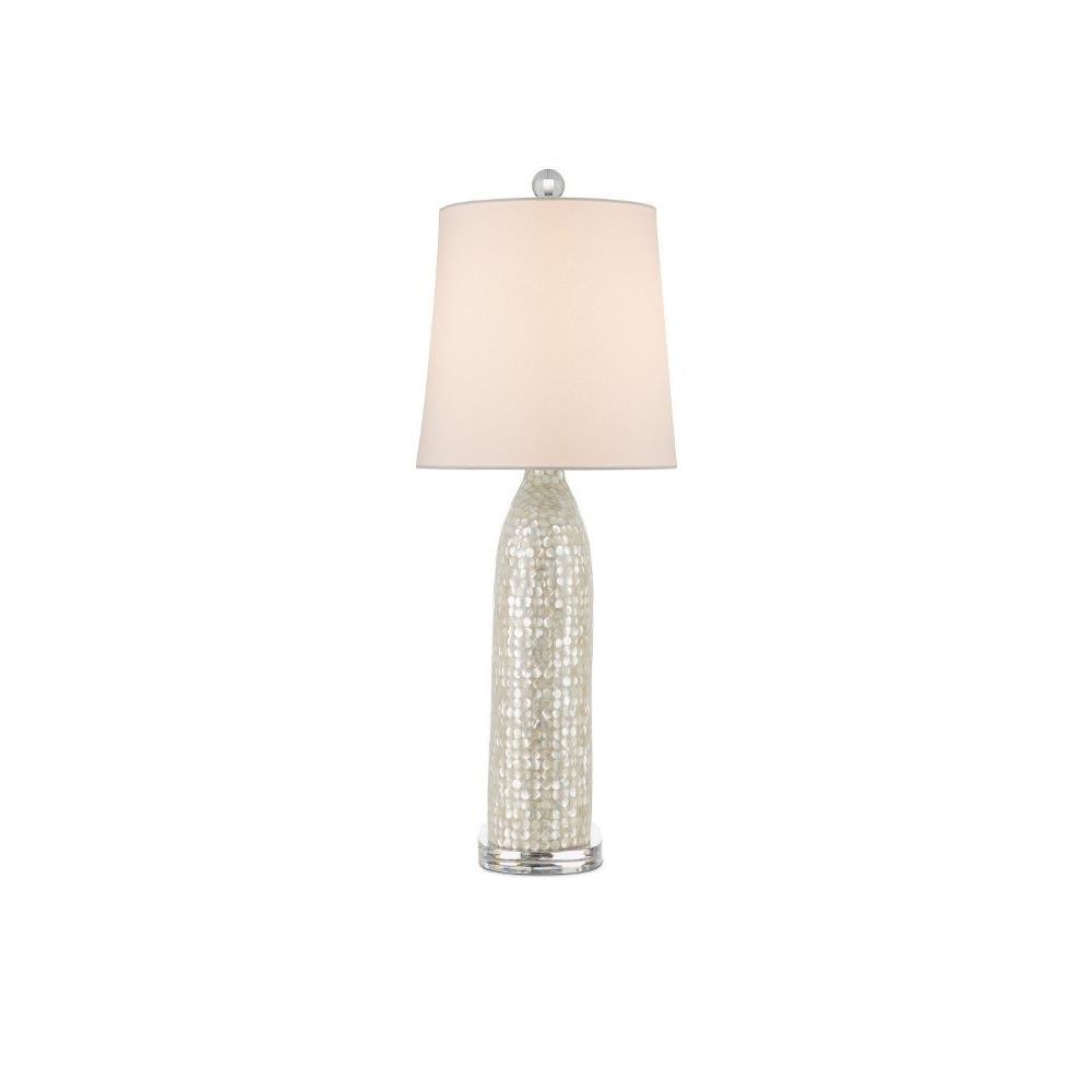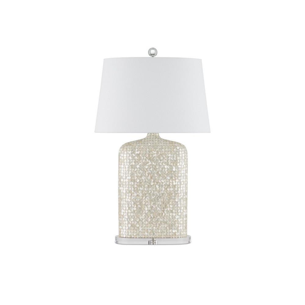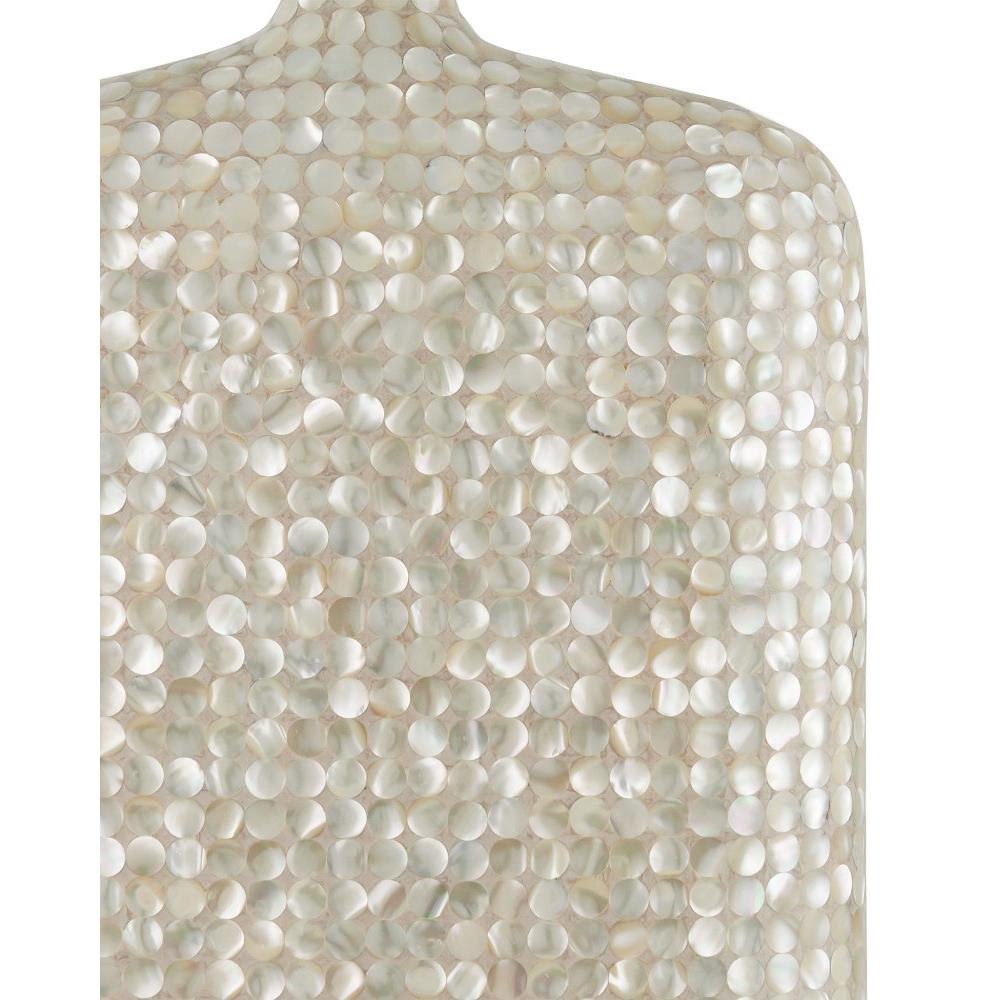 A shimmering composition, the Gerri Dot Table Lamp has a body covered in tiny circlets of mother of pearl. The bottle shape with its curving shoulders is surprisingly thin, as is the oblong shade. The slimness makes this white lamp a terrific choice for tabletops or chests where space is limited because it will sit close to the wall. Adding to the luminosity of the creation are the acrylic base and finial.