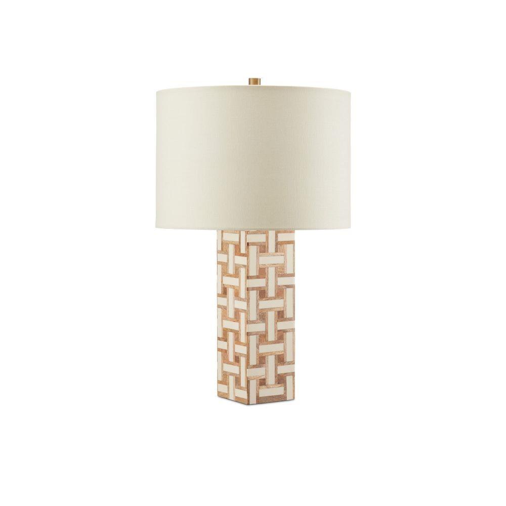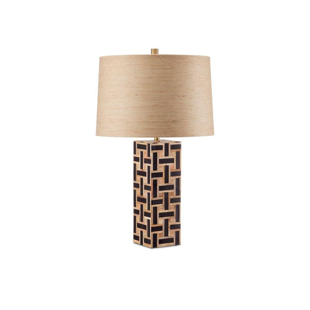 The Aarna Black Table Lamp, with its basketweave pattern, is made of pieces of wood interspersed with strips of black composite. The contrast of the textural woodgrains and the sleek composite creates an interesting aspect to this design, as do the angular lines of the rectangular body that echo the scale of the elongated pieces on its surface. The drum shade contributes to the feeling of complexity that is obvious with this design.