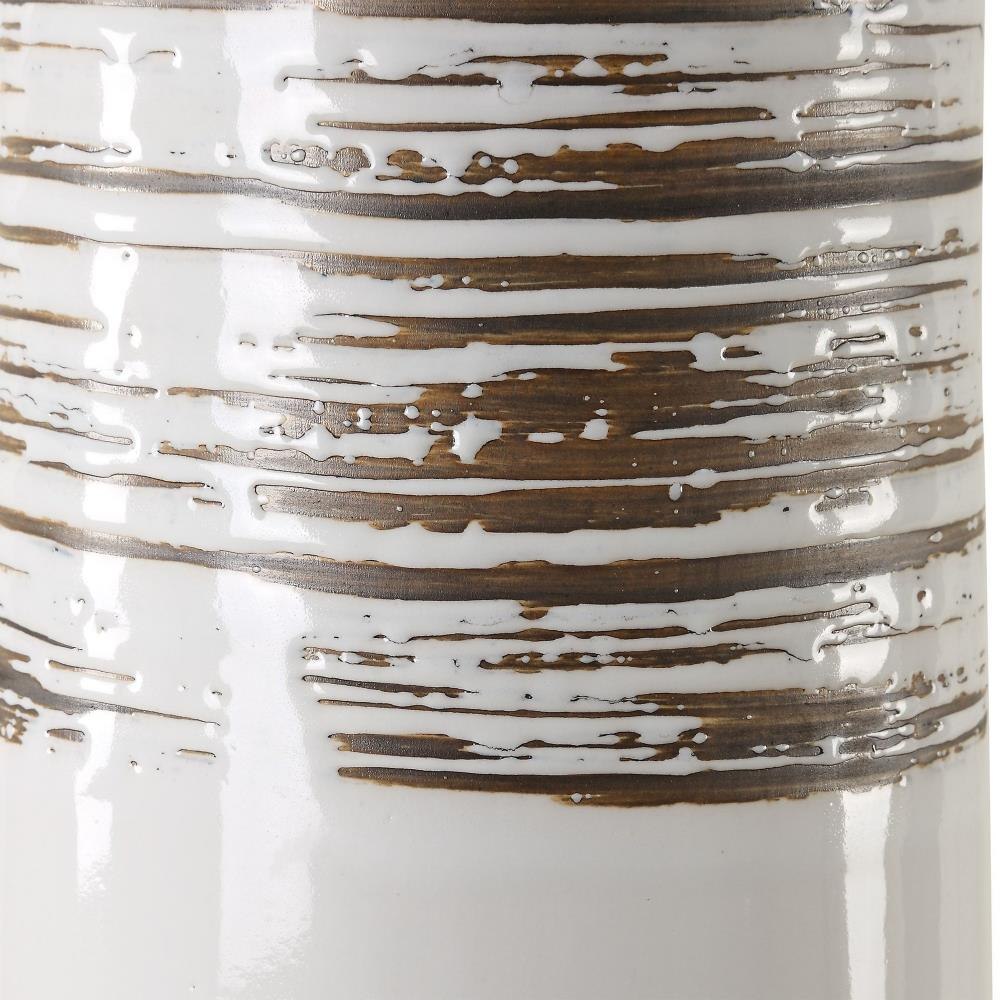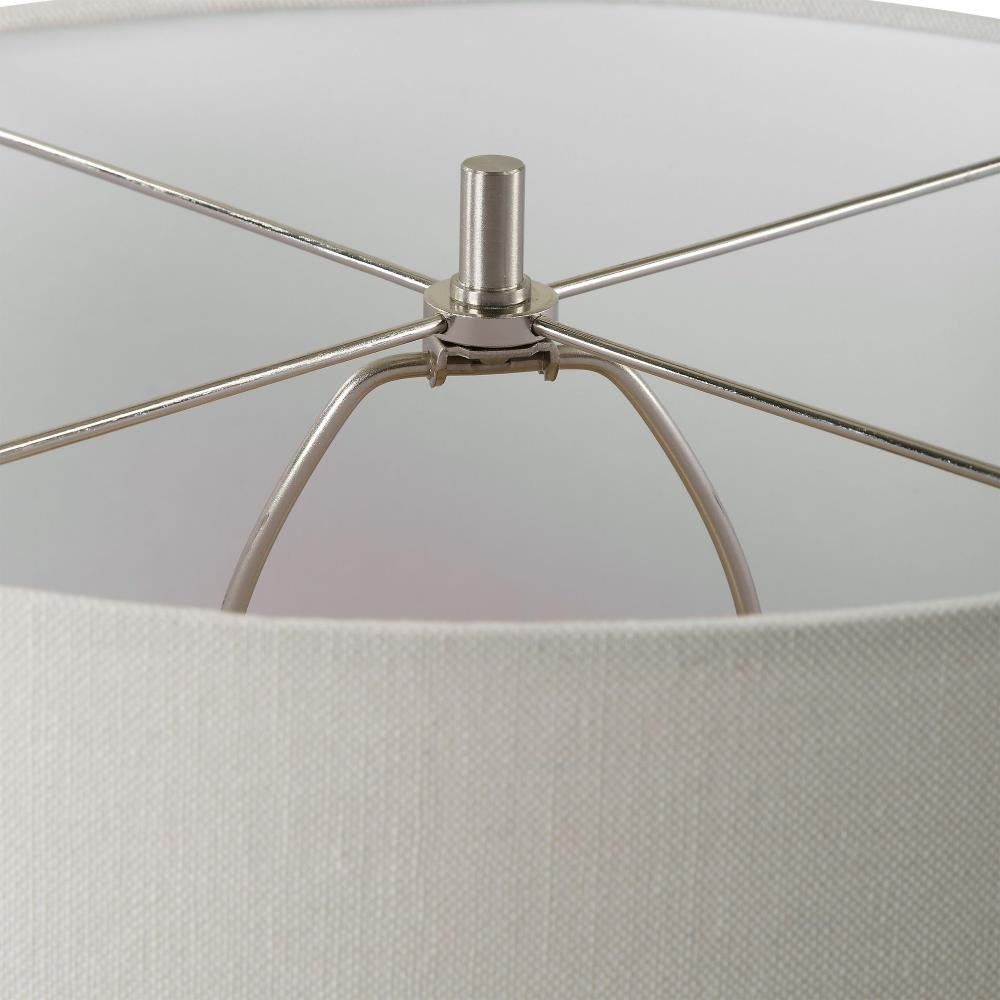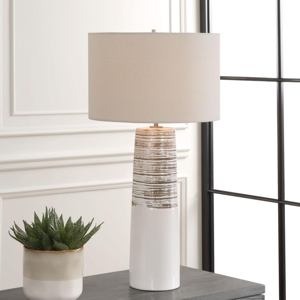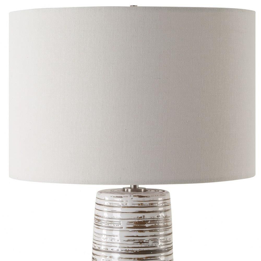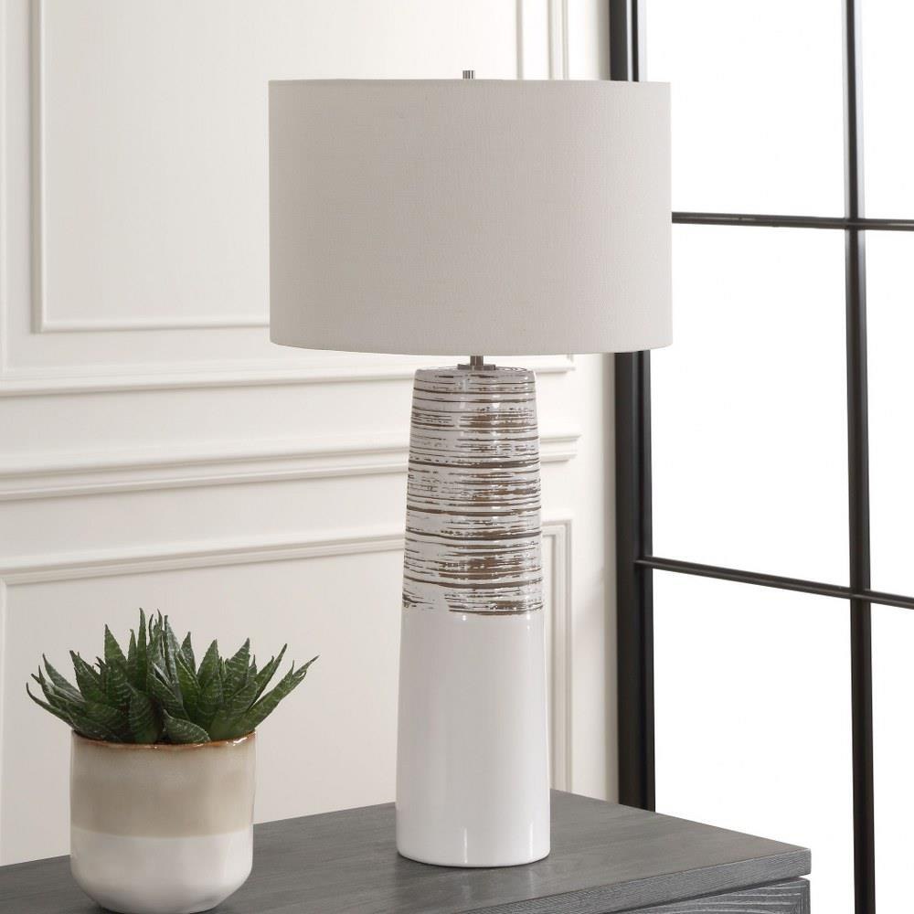 The Haven Table Lamp Combines Elegance With A Touch Of Rustic Charm. This Piece Features A Sleek Ceramic Base Cloaked In A Smooth White Glaze, Adorned With Subtly Ribbed, Distressed Accents, All Complemented By Brushed Plated Nickel Hardware For A Refined Finish. The Round Hardback Drum Shade Is Made In A Casual White Linen Fabric.