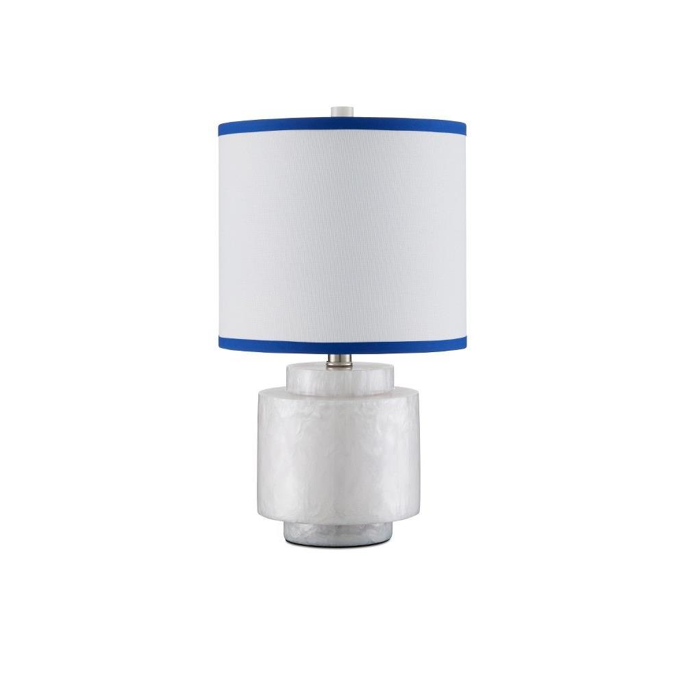 The Beryl Green Table Lamp has a luminous geometric body made of composite with a swirling green patterning throughout its composition. The shape is reminiscent of a 1940s design, which brings it a vintage feel, as does the shade trimmed in a matching green fabric. The scale of the shade is perfectly in sync with the lamp’s round body.