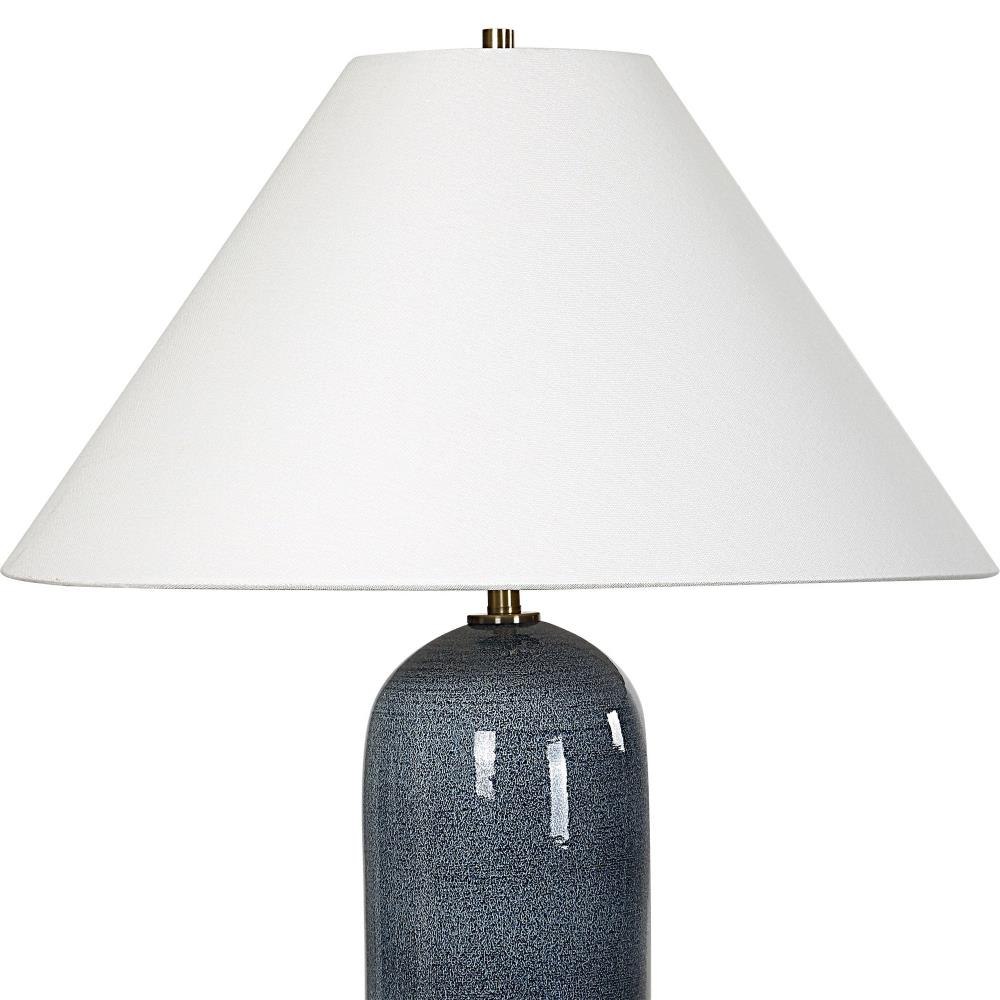 This Hand Spun Ceramic Table Lamp Boasts A Stunning Deep Blue Glaze With Subtle Textural Undertones, Beautifully Complemented By Plated Antique Brass Accents. Due To The Nature Of Fired Glazes On This Hand Crafted Ceramic Lamp, Finishes And Size May Vary Slightly. The Tapered Round Hardback Shade Is In A Casual White Linen Fabric. Due To The Nature Of Fired Glazes On Ceramic Lamps, Finishes May Vary Slightly.