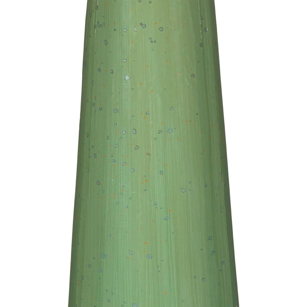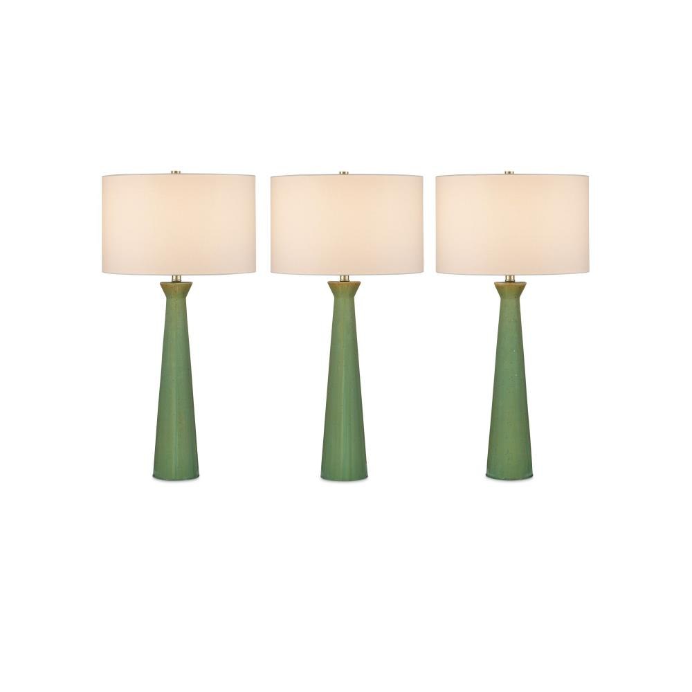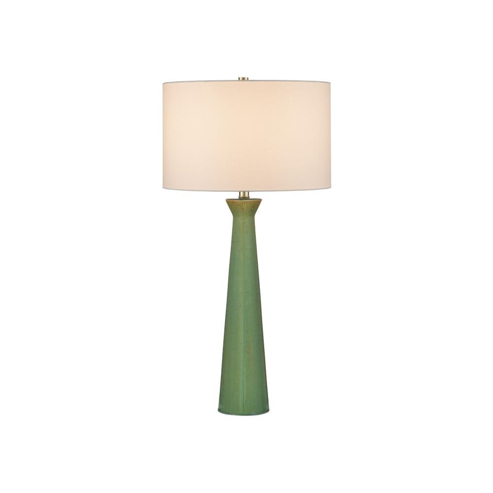 The Grassington Table Lamp features a telescoping columnar silhouette crafted from ceramic and finished with a reactive celadon glaze. Poured by hand, the glaze creates a natural ombré effect—light at the top and gradually deepening in tone as it flows downward—giving the surface depth and movement. The slender green form is paired with an oversized drum shade that adds a bold contrast to the lamp’s refined shape.