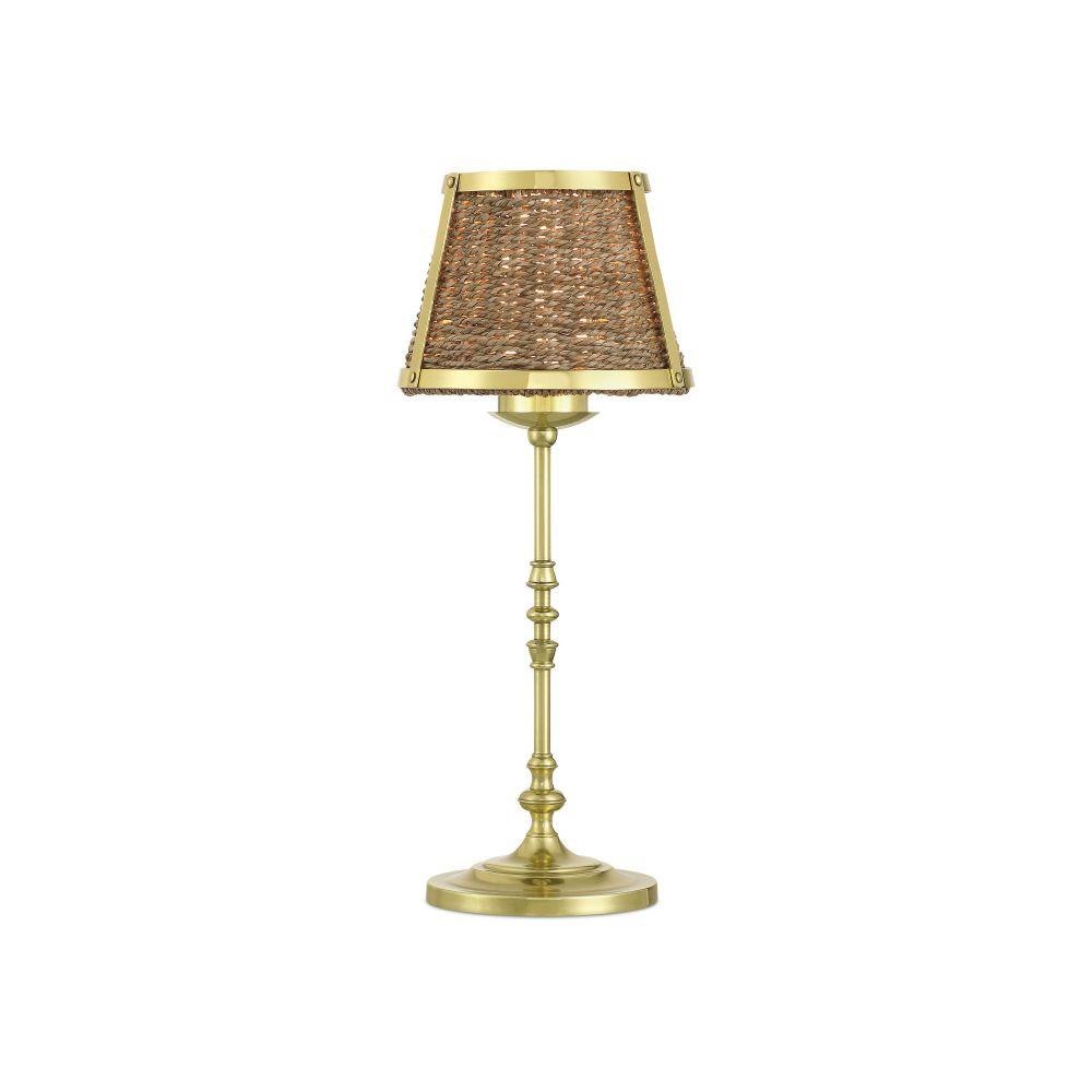 The Currey & Company Deauville Cordless Table Lamp is a woven table lamp with a shade made of natural seagrass and steel in a polished brass finish for a French feel.