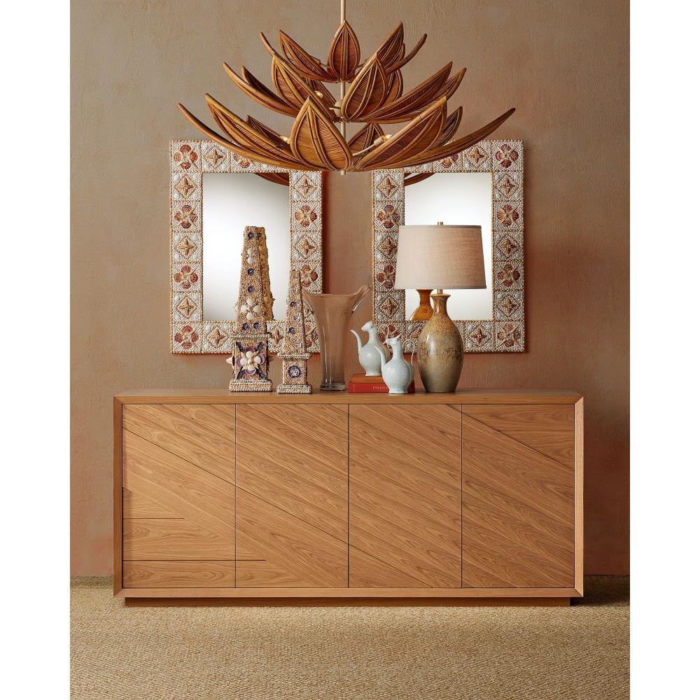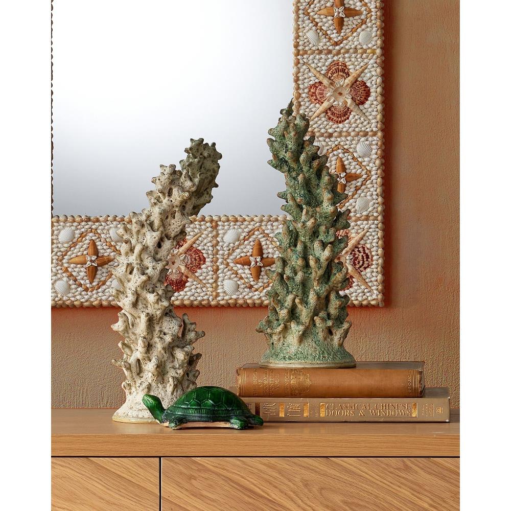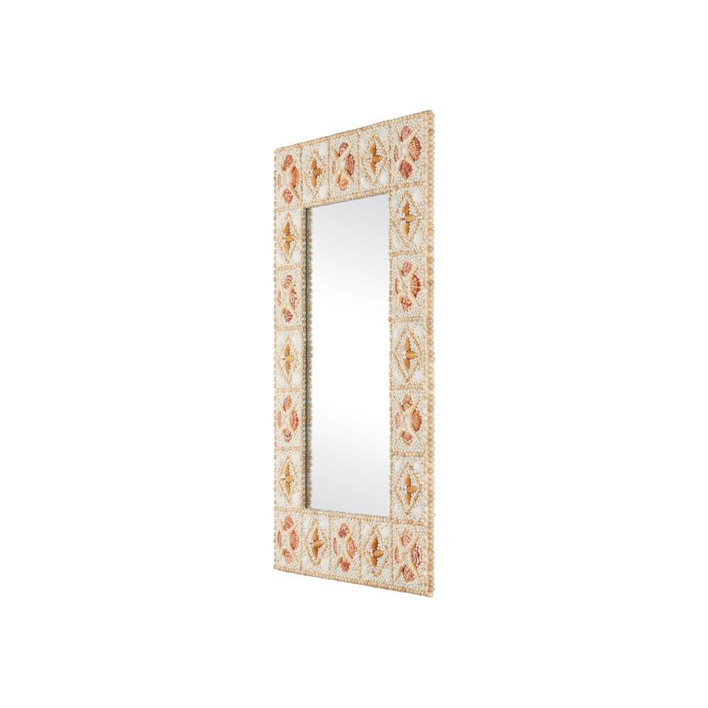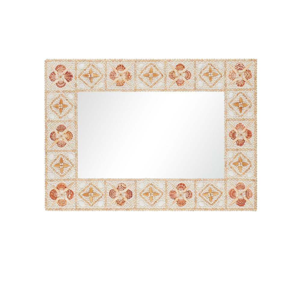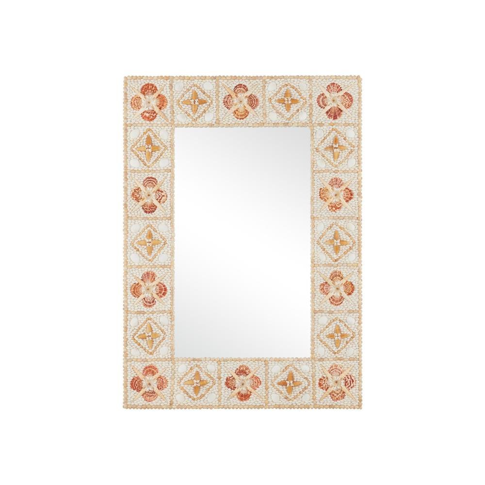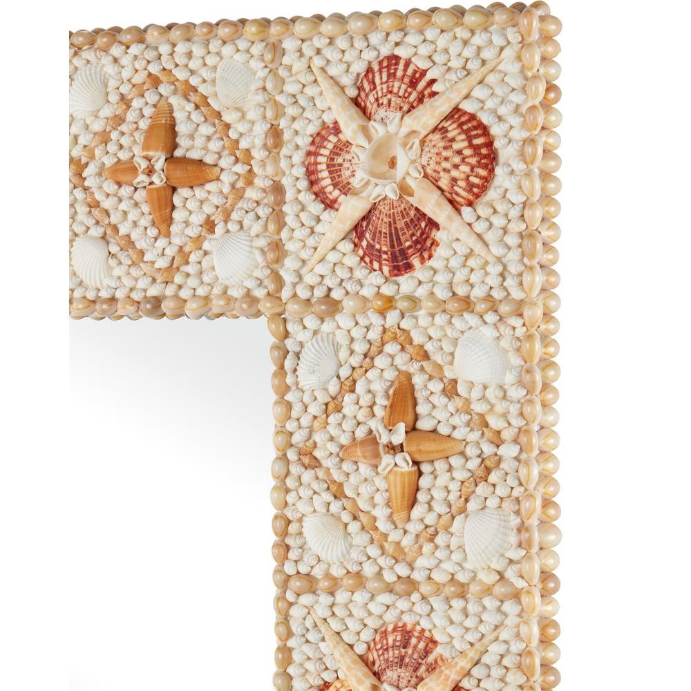 The Junonia Rectangular Mirror has a stunning shell-incrusted frame created in the tradition of coquillage, one of the world’s oldest forms of mosaics made of natural shells. Its intricate surface pattern features delicate floral motifs in shades of pale peach, white, and purple. Each decorative mirror, which will include cleats for hanging horizontally or vertically and extra shells, will vary slightly given the shells are natural.