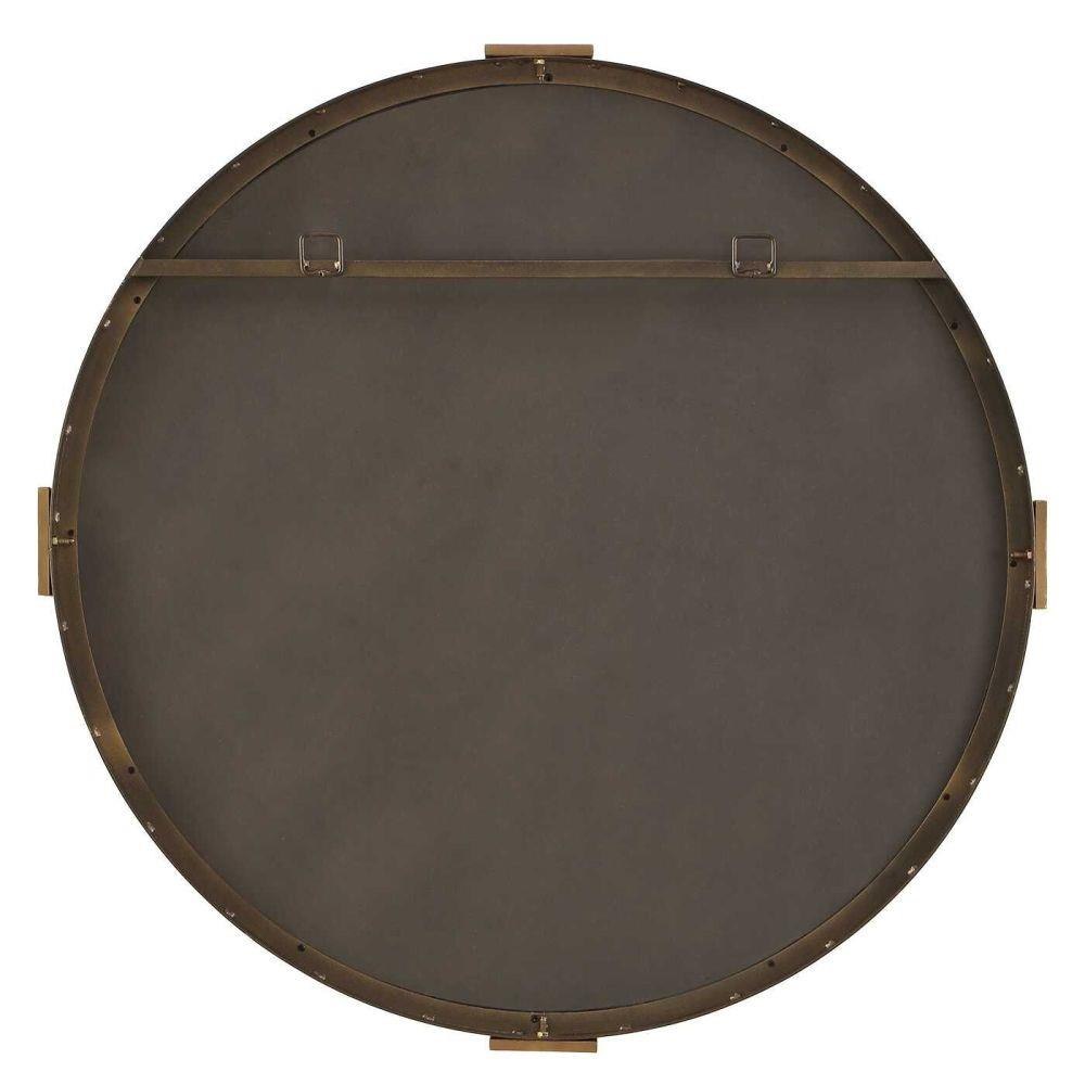 This Elegant Round Mirror Features A Sleek Iron Band Frame With A Golden Bronze Finish, Beautifully Accented By Decorative Travertine Inlays.
