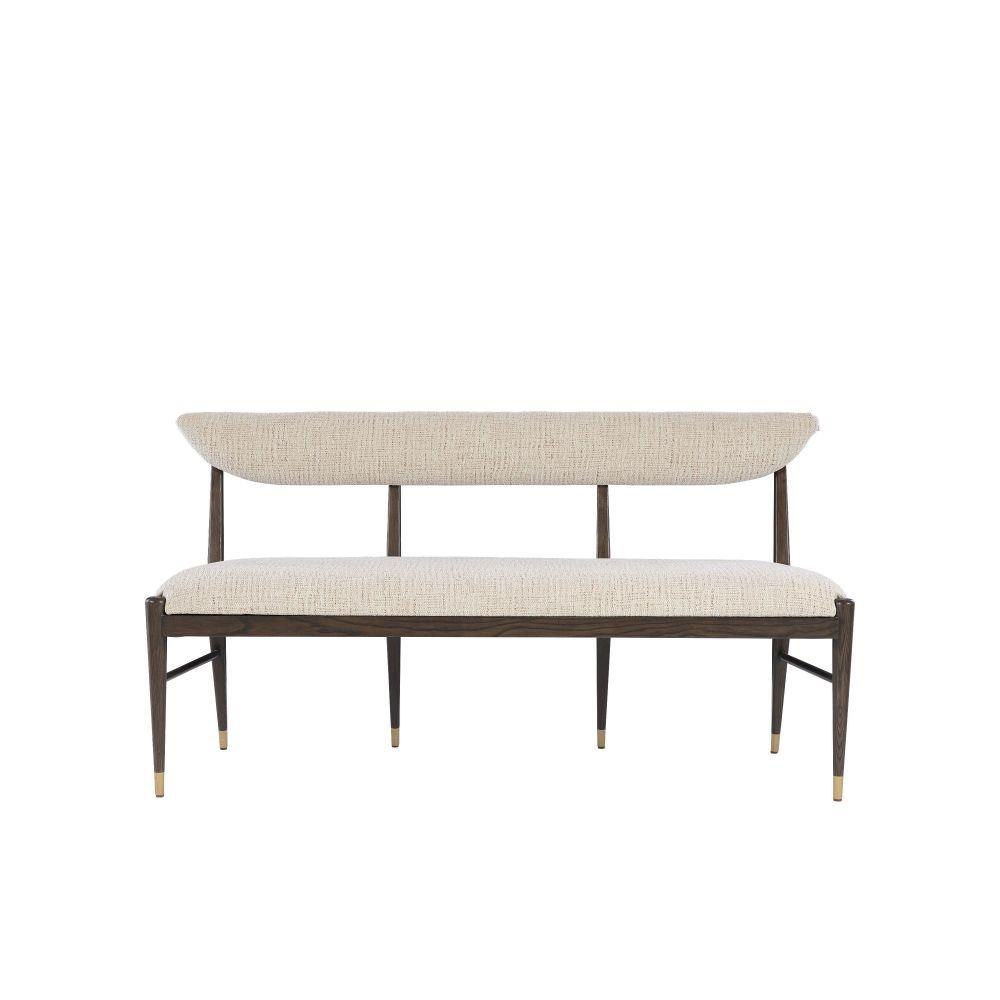 The Arlan Coffee Bench, which is made of ash wood in a coffee brown finish, has tailored contemporary lines. The back and seat are covered in a nubby performance fabric called Busio Desert, and the tapered legs that run along the sides and back are sophisticated design details on this piece of upholstery. The ferrules on the dark brown and white bench are in an antique brass finish.