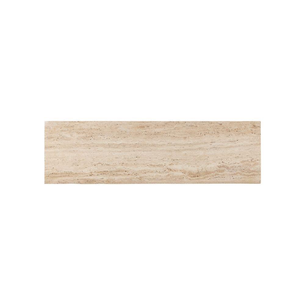 The Demi Travertine Console Table is made of solid travertine. A bevel softens the oval that is carved into the stone on both sides of its pedestal to infuse the tan console table with sophistication, as the cut-out forms an oculus. The way the pedestal tapers to a smaller form toward the top is a shapely design move, as is the chamfered detail under the top. This table has a dynamic personality thanks to the veining in the stone, which means each one will be unique.