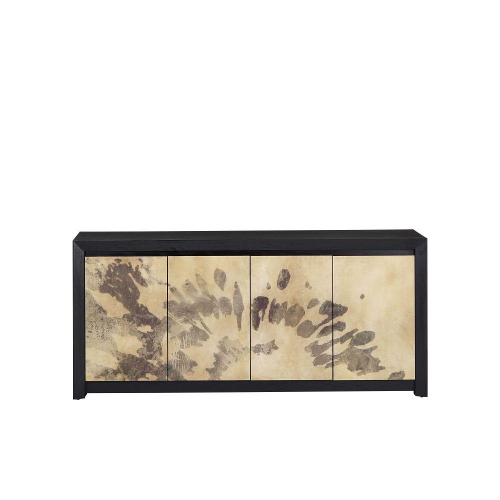 The Karlson Credenza is made of solid oak covered with natural vellum veneer. The caviar black finish on the frame complements the artful pattern on the doors. Soft-close hinges, eight adjustable shelves, adjustable glides, a center foot with a leveler, cord management, and anti-tip kit make this tan and black credenza a well-made choice. We also offer the Karlson in a console table.Soft Close Hinges, 8 Adjustable Shelves, Adjustable Glides, Center Foot with Glide, Cord Management, Anti-Tip Kit.