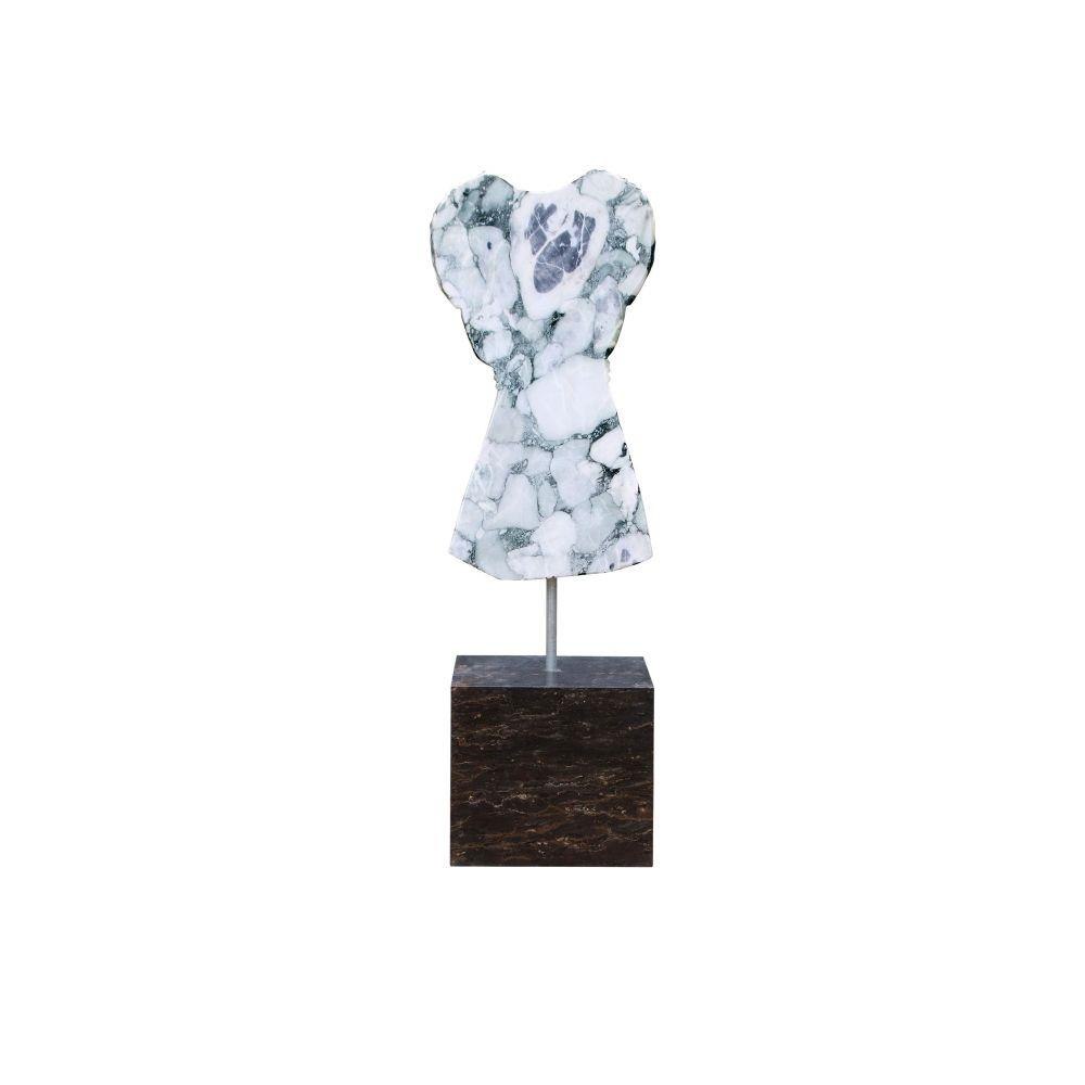 The Adara Marble Dress Sculpture has a famed fashion house to thank for its profile. Modeled after a vintage Lanvin cocktail dress from the 1970s, the chic sculpture is a fashion-forward accessory. The dress is made of pale blue and off-white marble, while the square base is made from black marble, which has a more subtle veining than the more dynamic surface.