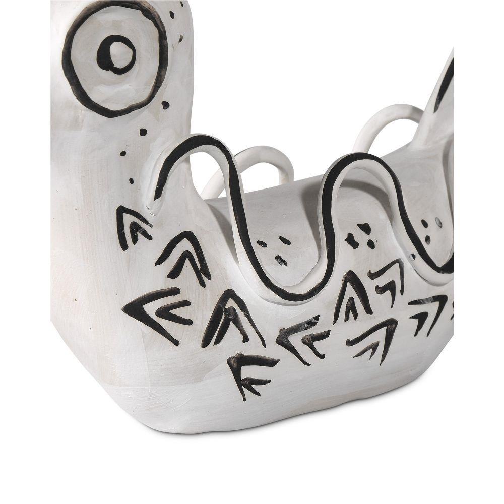 Artist Xiang Yang, a brilliant ceramist, took a walk on the wild side when he created Eunice the Duck. Made of porcelain in a washed-white finish with black whimsical details painted by the artist, the haunting vessel will create a stir not unlike Picasso's work did during his ceramics period as he experimented in the South of France.