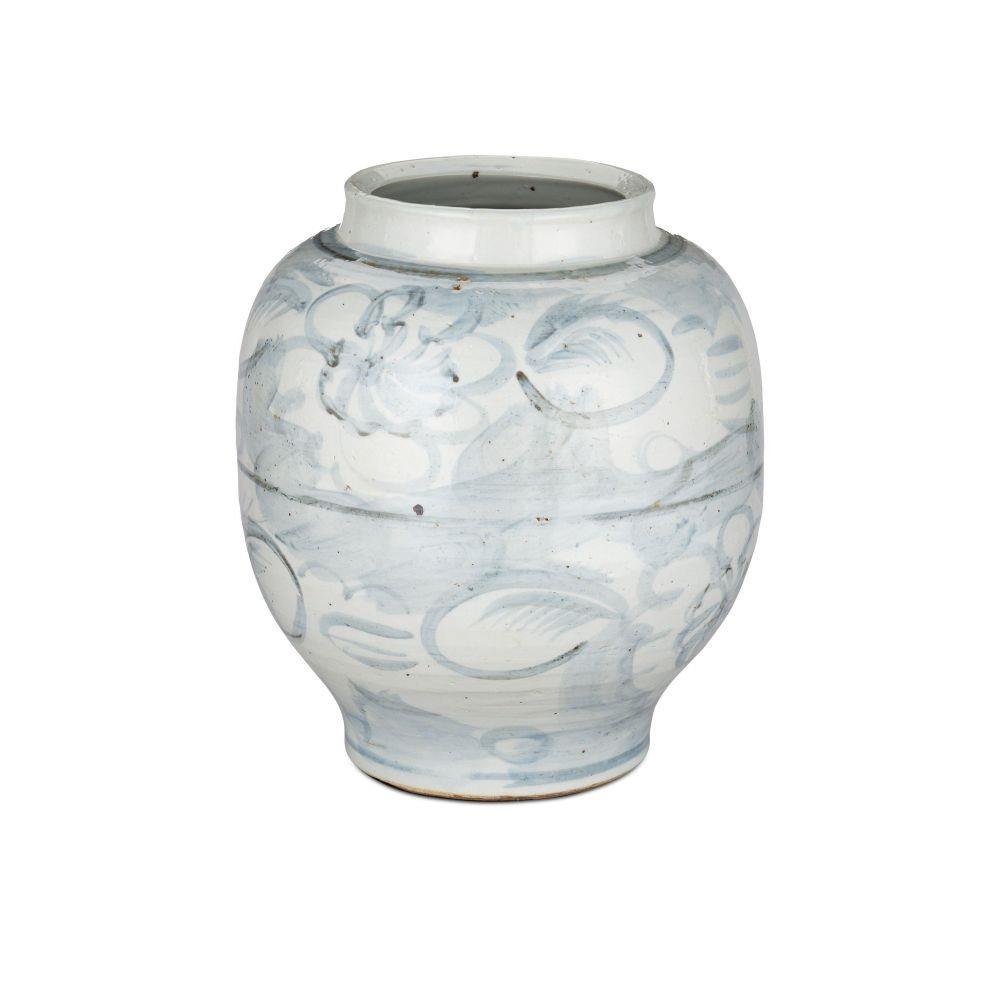 Modern interpretations of the tradition of Chinoiserie that dates back to the great dynasties in Asia, the Ming-Style Countryside Large Preserve Pot is made of porcelain. The design tells its "story" in pale blue motifs on an off-white ground. Because these are artisanal pieces handmade by families with generations of expertise, the color and pattern may vary slightly.