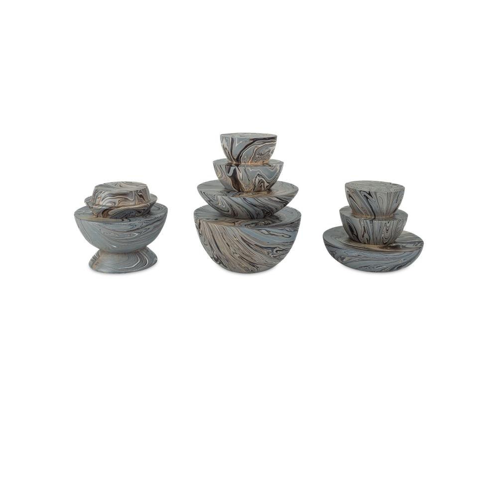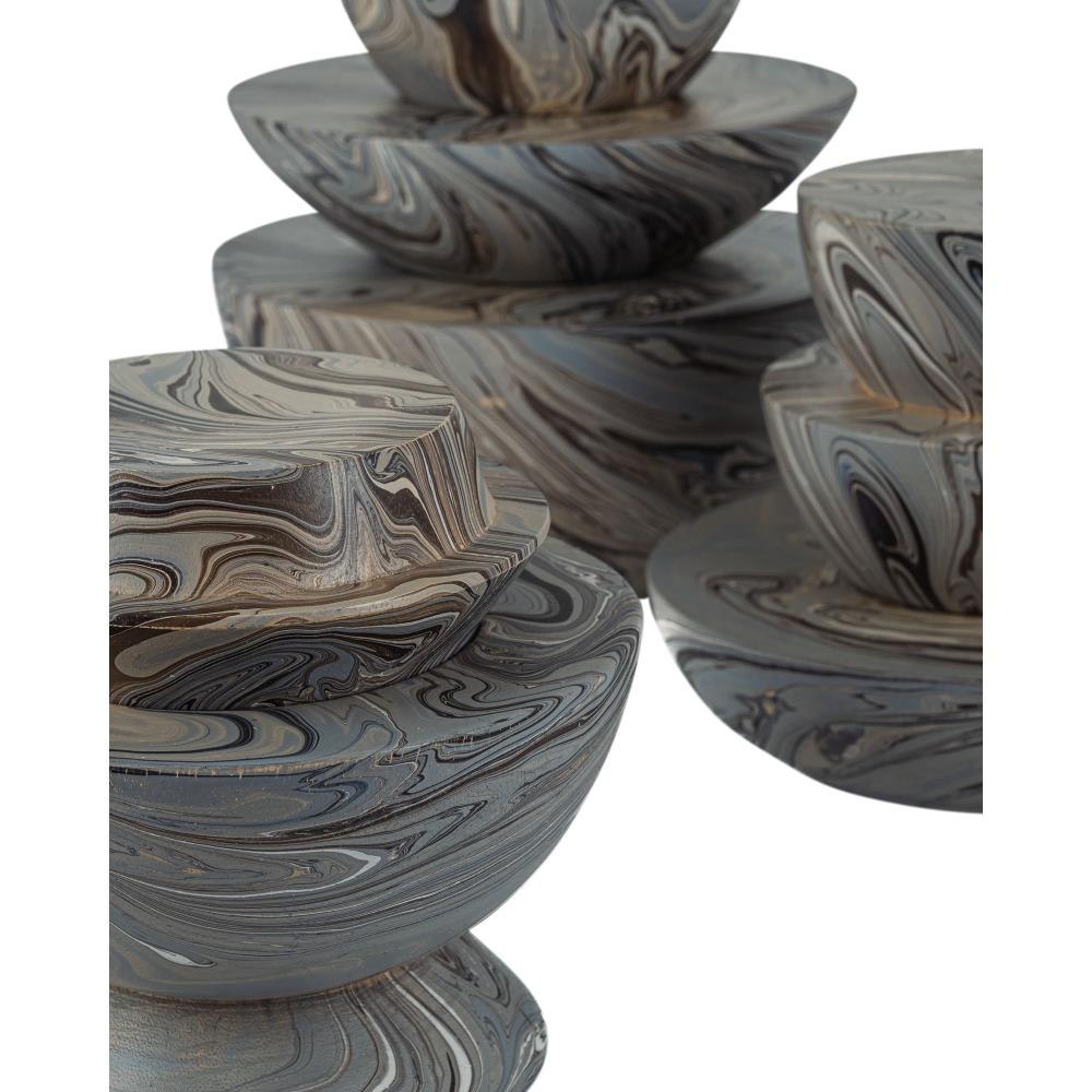 The Marbleized Stacking Box Set features three decorative containers, each with a unique stacked form that adds visual intrigue. Made from wood, these organically shaped boxes are treated with a sophisticated gray marbleized technique that gives their rounded surfaces a dynamic, fluid appearance. They are perfect for storing small treasures or serving as stylish accents.