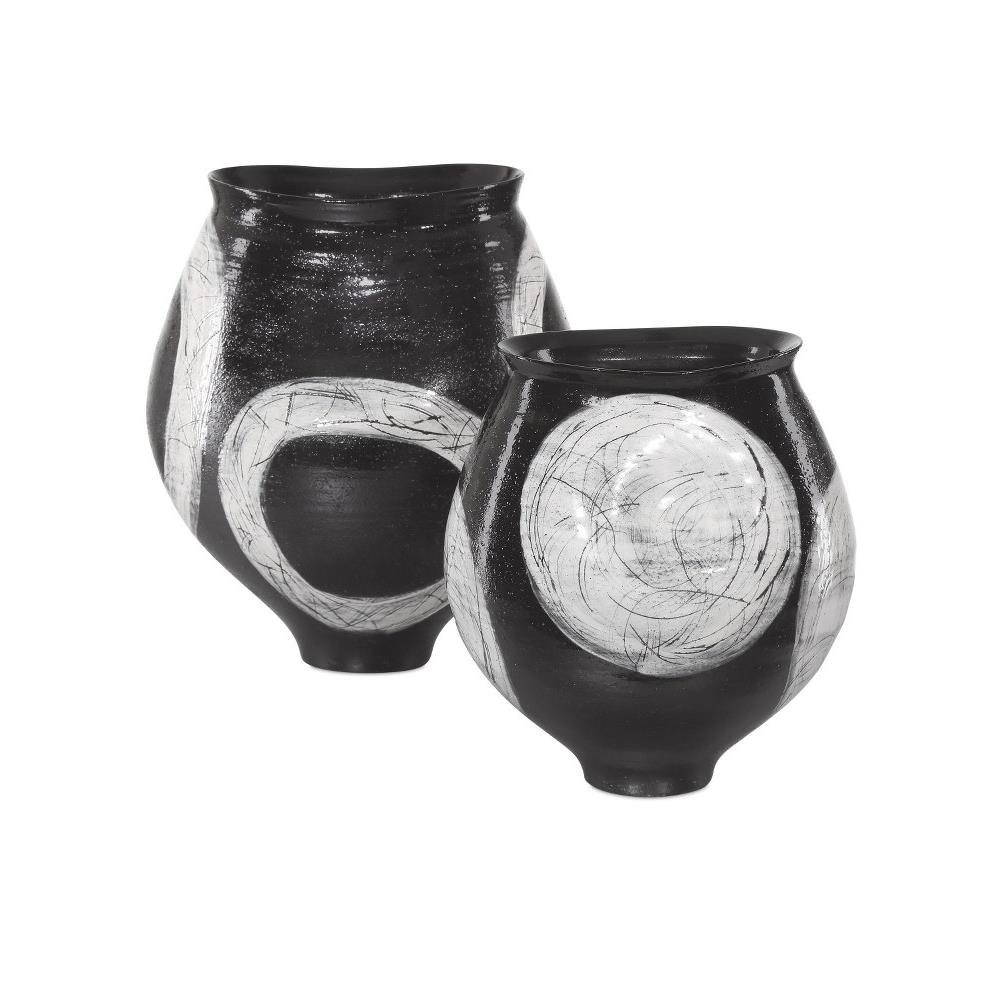 The Nakamura Vase is an artisanal creation made of porcelain that is hand-thrown, hand-glazed, and hand-decorated. The pale gray and black vessel has intentional pitting on the surface. Because the motifs on this vase are created by hand, each will vary slightly as each artist puts his brush to the surface of the glazed material in his or her own unique way. A design detail worth noting is how the vase sits on a smaller rounded bottom, while the irregular oval top reflects the swell of the vessel's shape.