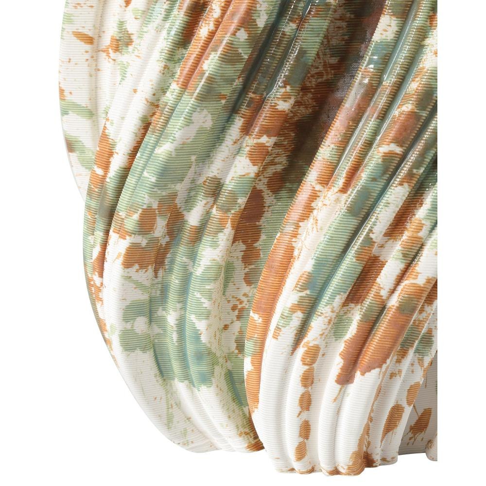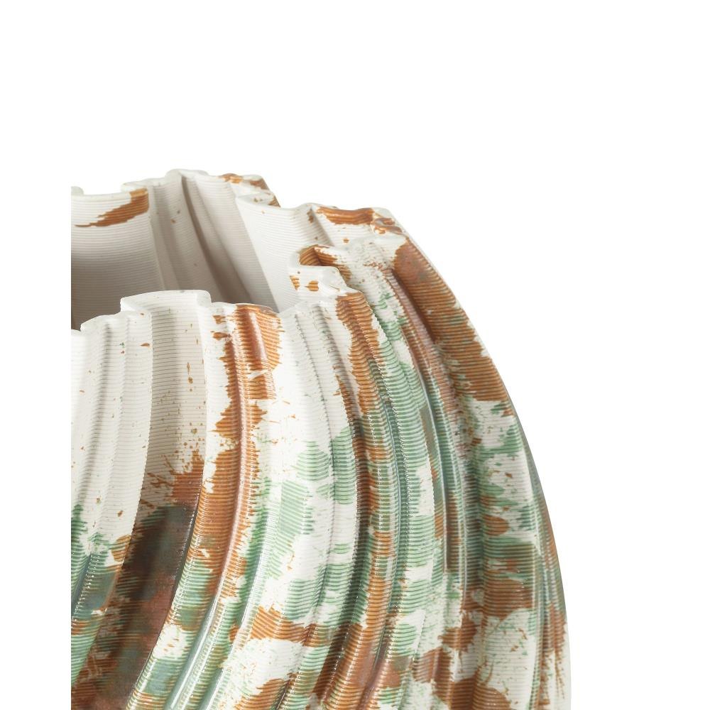 Modern design meets artistic expression in the Camouflage Small Vase. Made from 3D-printed porcelain, this sculptural vessel features a striking swirl shape that has a bold movement to it. Each piece is hand-splattered with green and dark orange glaze before firing, creating a unique camouflage-like pattern that ensures no two vases are exactly alike. The blend of precision printing and hand-finished detailing results in a bold, one-of-a-kind accent.