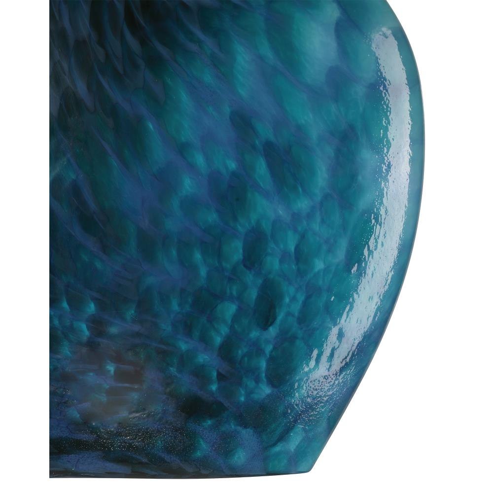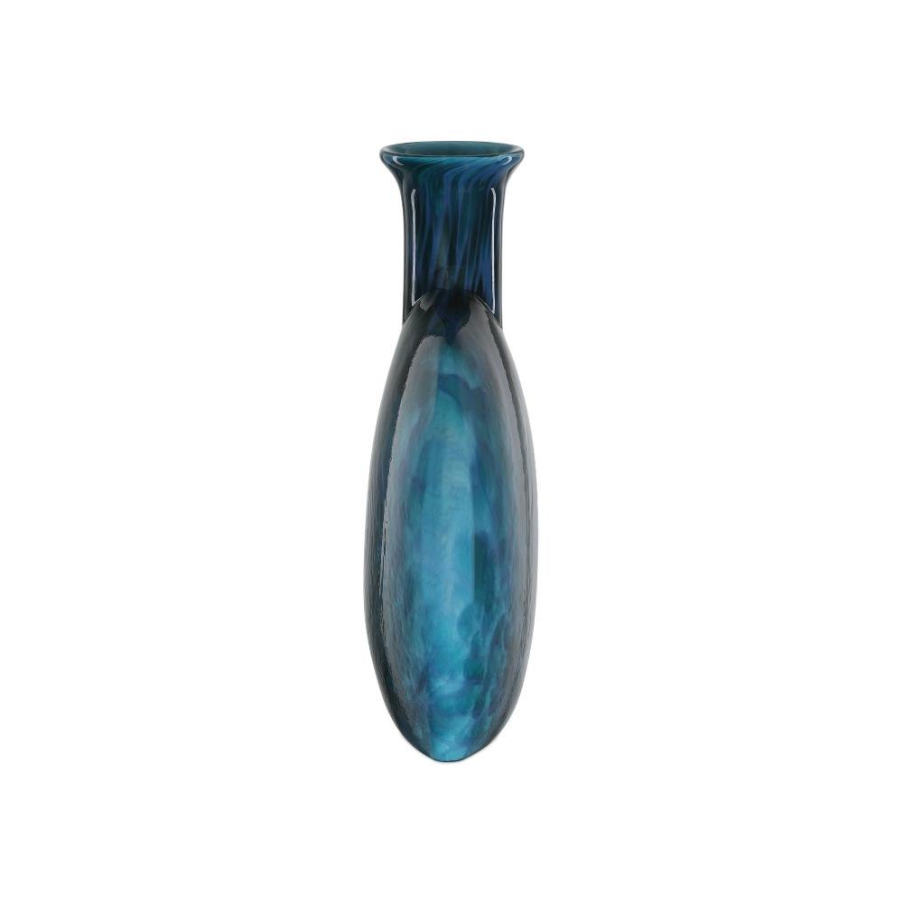 The Pavonini Vase is a stunning piece of mold-made glass in a brilliant shade of blue that is shaped like an oversized perfume bottle. Its captivating surface features a mesmerizing sense of movement, achieved through the fusion and marbling of deep blue and bright teal glass that creates a rich interplay of color and texture. The glass vase is shallow so it can sit close to the wall to take up less surface space on a console or nightstand.