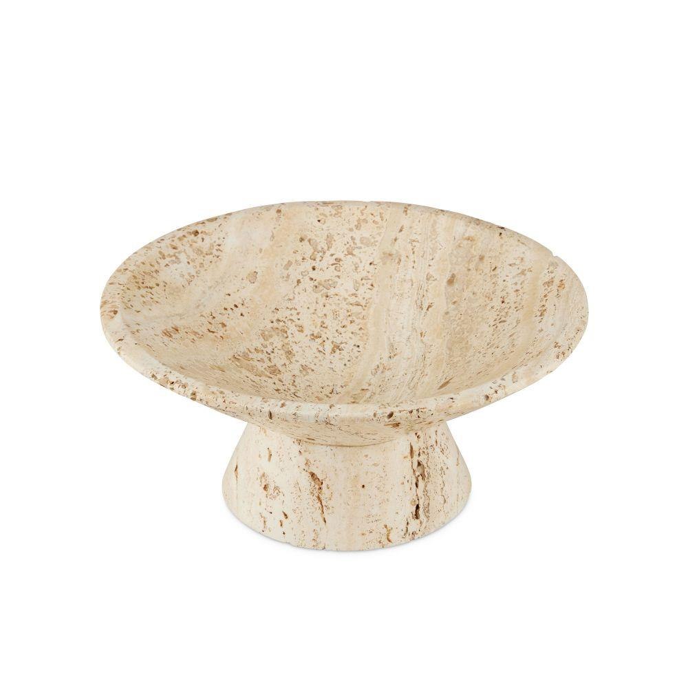 The Lubo Travertine Small Bowl is made of Travertine, which has a swirling personality as fluid as the shifting sands of the desert. The tan footed bowl will be a chameleon in an interior, as it will be just as fitting for holding decorative objects in a main living space as it will be for displaying brightly-colored ornaments during the holidays. The surfaces will vary from piece to piece.