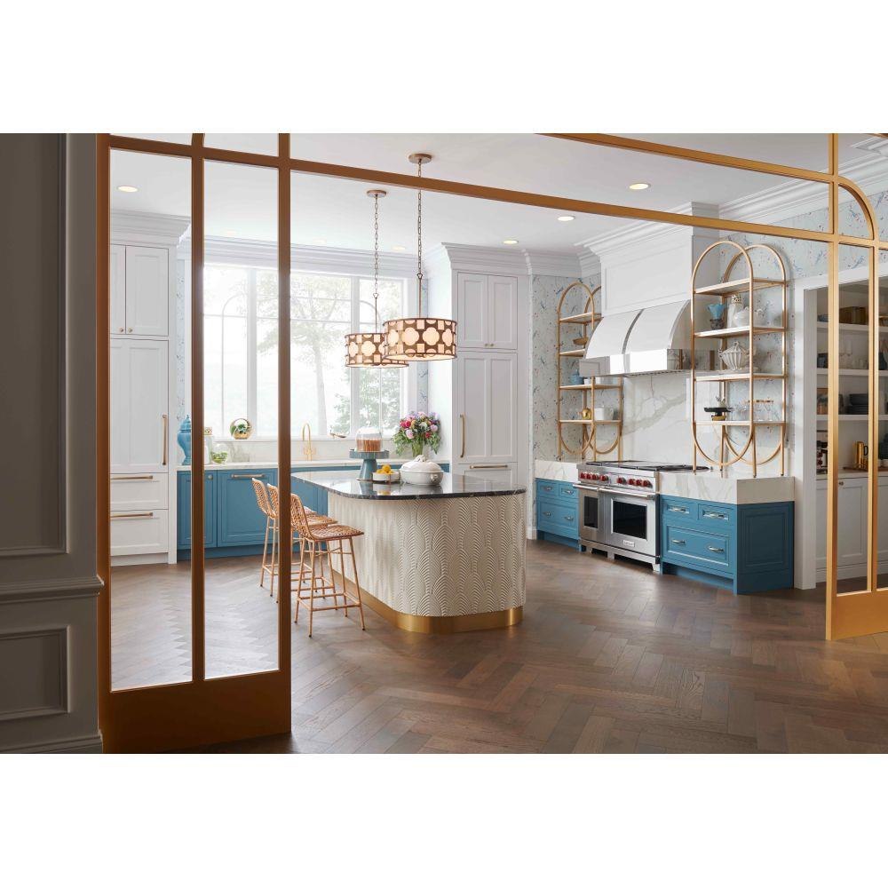 Carter is a traditional drum silhouette with details galore. An intricate, hand-riveted pattern in Burnished Gold encompasses the off-white textured fabric shade. A decorative candle cluster bursts within to further enhance this dynamic design.