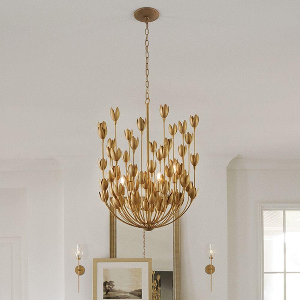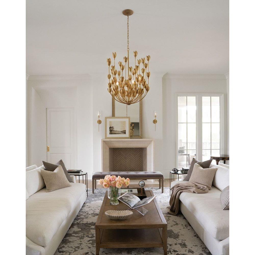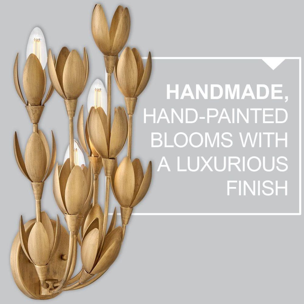 Flora is a work of art inspired by the delicate nature and beauty of florals. Blurring the line between lighting and sculpture, Flora’s handmade, hand-painted blooms mesmerizingly unfold while the bulbs beautifully nestle inside.Suitable for use in dry (indoor) locations as defined by NEC and CEC. Meets United States UL Underwriters Laboratories & CSA Canadian Standards Association Product Safety Standards / This chain or cable hung fixture may be installed on any sloped ceiling / Luxurious gold finish with opulent sheen / Eclectic style that mixes unconventional elements; unique and sophisticated designs that feel modern and vintage at the same time. / The Lisa McDennon Collection offers a striking mix of edgy, sculptural silhouettes that incorporate modern, organic elements and luxe materials, brought to life by her innovative and original point of view.
