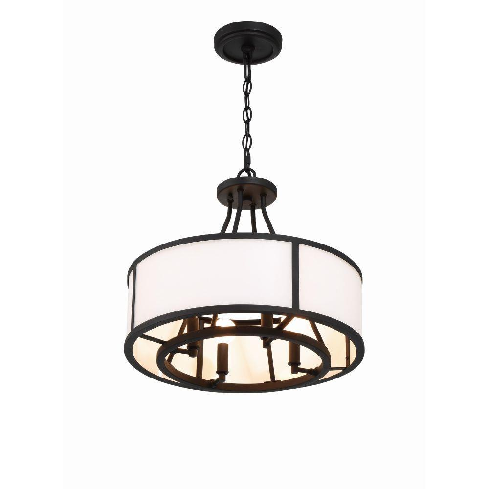 Showcasing a classic drum pendant, the Bryant is crafted with a white glass shade and black steel frame. The outer drum surrounds an inner suspension of candelabra sockets. The contrasting materials and bold graphic lines provide a design-driven style and a striking visual accent to many interior settings.