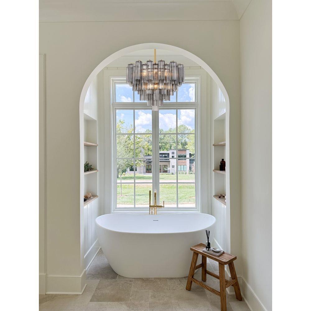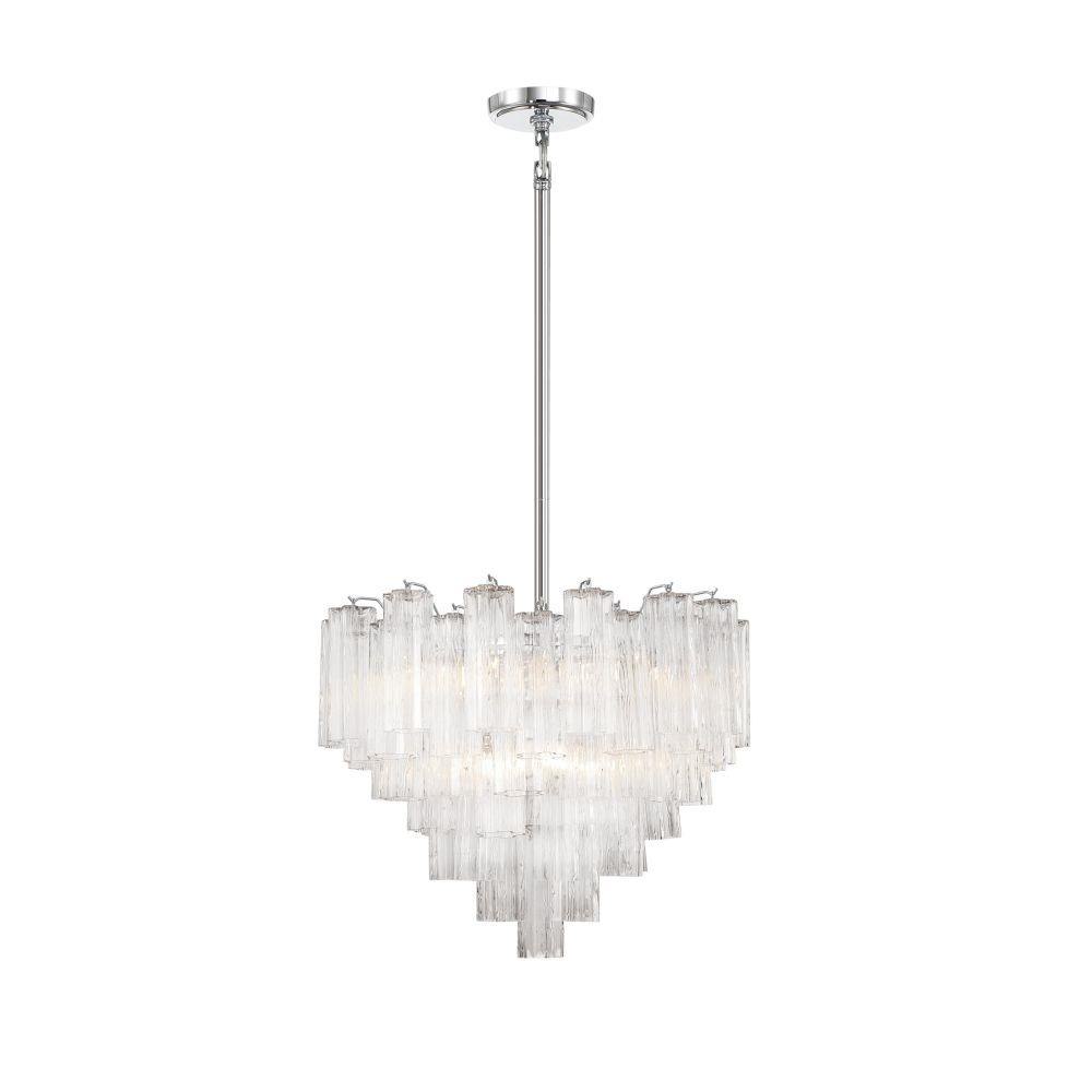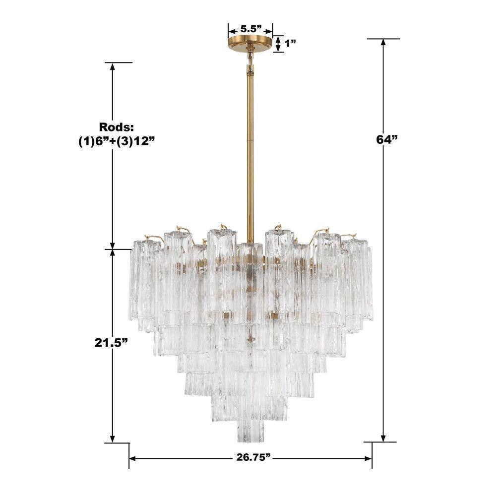 The captivating Addis Lighting Collection is a modern-day interpretation of the iconic mid-century Tronchi chandelier. Inspired by its predecessor's sleek lines and geometric shapes, the Addis features a polished Chrome or Aged Brass metal frame that exudes sophistication and style. Its unique design showcases transparent tiers of textured Tronchi glass tubes, forming a mesmerizing 5-point rounded star shape. Choose from a range of glass colors, including clear, amber, smoke, and white, or the stunning Autumn option, which features a captivating multicolor disposition of amber, clear, and smoke Tronchi glass. The Addis Lighting Collection offers various sizes and finishes, allowing you to find the perfect fit for your space while adding a touch of timeless elegance.