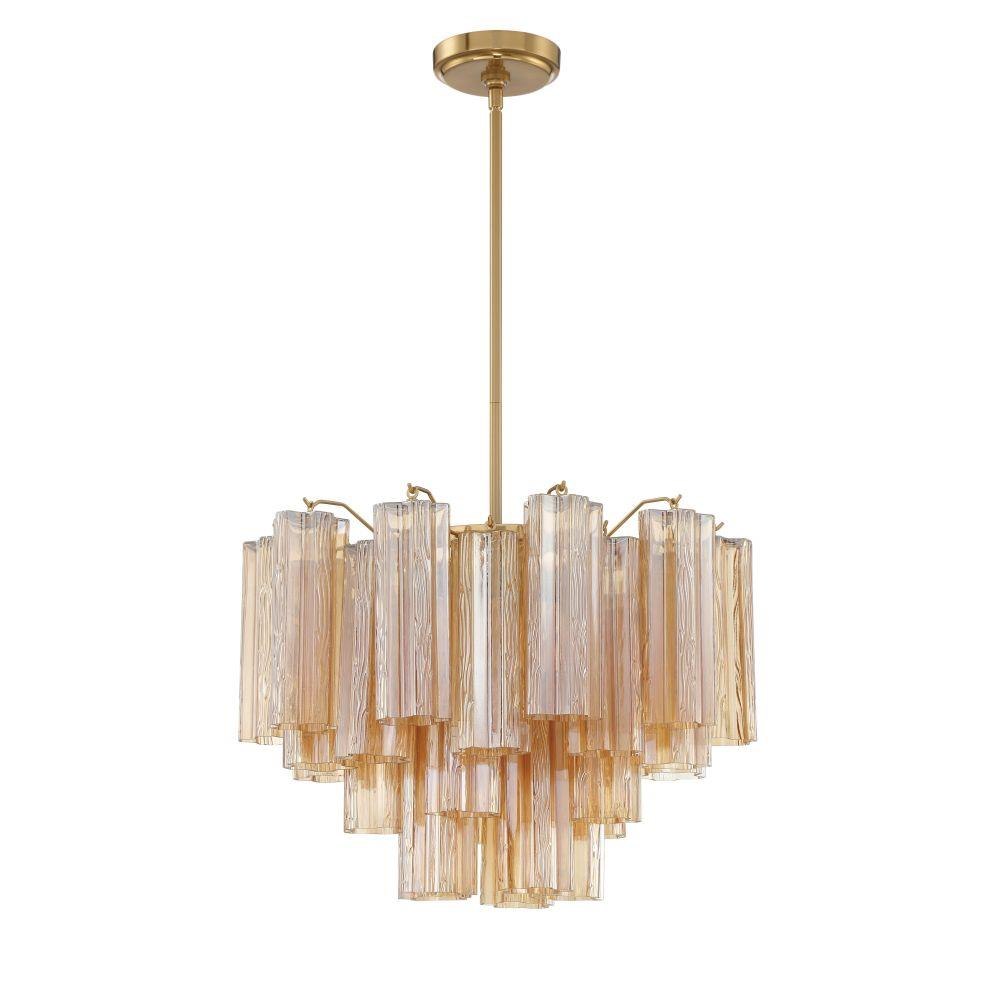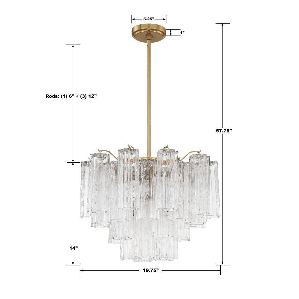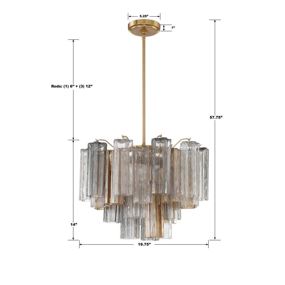 The captivating Addis Lighting Collection is a modern-day interpretation of the iconic mid-century Tronchi chandelier. Inspired by its predecessor's sleek lines and geometric shapes, the Addis features a polished Chrome or Aged Brass metal frame that exudes sophistication and style. Its unique design showcases transparent tiers of textured Tronchi glass tubes, forming a mesmerizing 5-point rounded star shape. Choose from a range of glass colors, including clear, amber, smoke, and white, or the stunning Autumn option, which features a captivating multicolor disposition of amber, clear, and smoke Tronchi glass. The Addis Lighting Collection offers various sizes and finishes, allowing you to find the perfect fit for your space while adding a touch of timeless elegance.