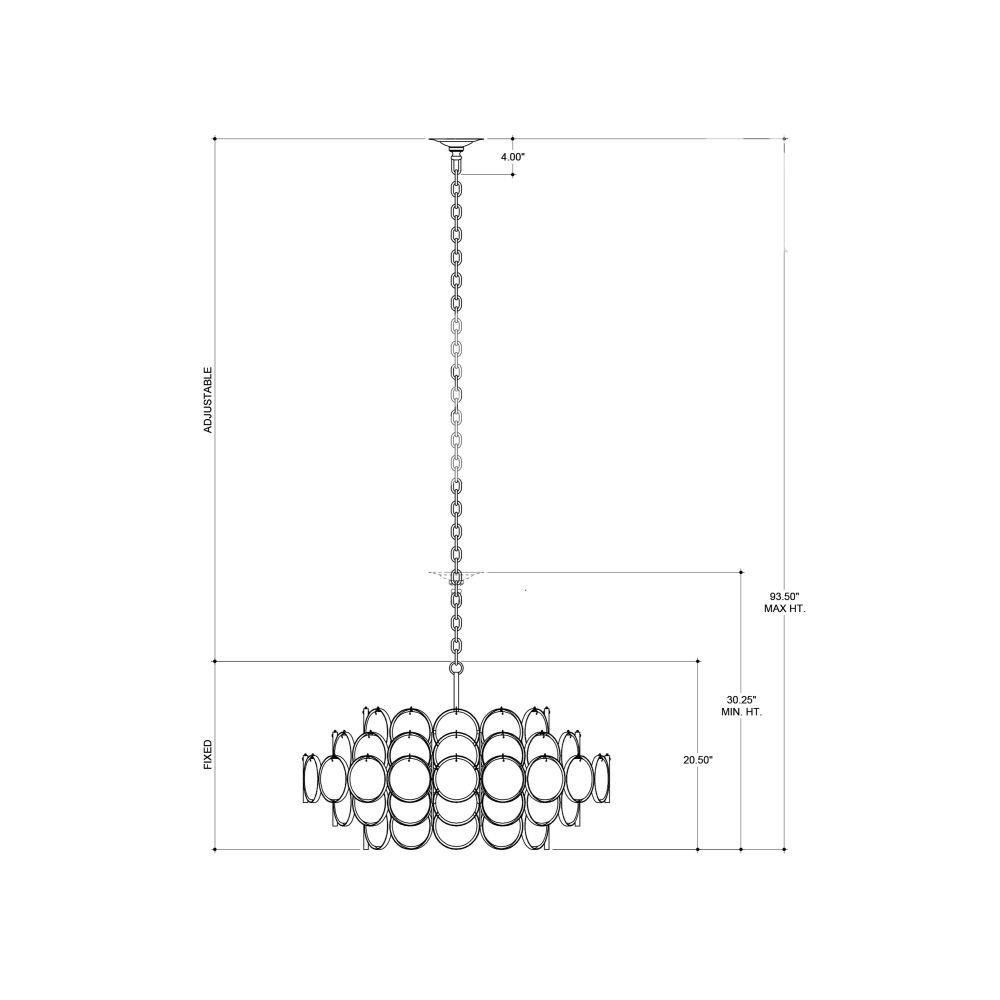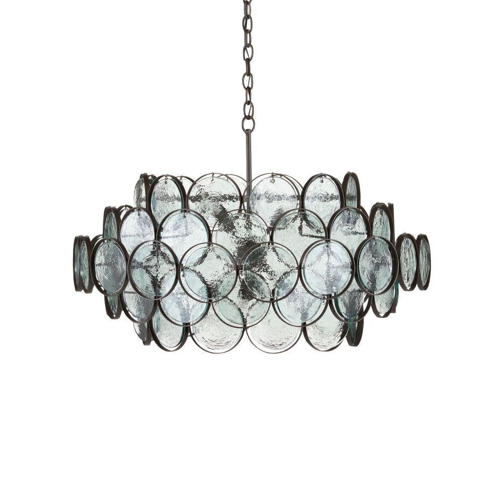 Myriad recycled, recast glass discs are individually attached by hand to hang from a wrought iron frame finished in bronze to make the shapely Galahad Small Chandelier a true statement piece. The ample charm of the fixture is heightened by the glass, as the light source travels around the shade to glint through each one of the discs depending upon the position from which it is viewed.