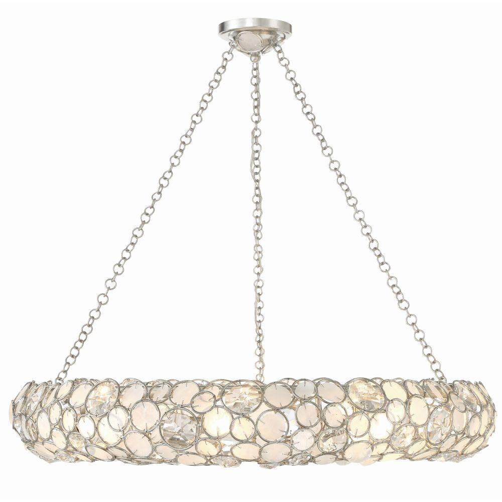 The Palla Ring chandelier is fitted with different sized round, hand-pinned, organic, and naturally textured Capiz shells, creating a unique texture and sparkle that play with the interplay of light and shadow. Faceted cut crystal jewels nestled within overlapping metal circles offer depth and dimension, elevating the chandelier into a work of art. Its open-ring design at the top directs light upward, creating a warm and inviting ambiance, and casts a gentle, downward glow. The same enchanting Capiz shells and crystal details that grace the fixture are mirrored on the canopy, ensuring that every aspect of the Palla Ring Chandelier exudes a sense of organic luxury and sophistication.