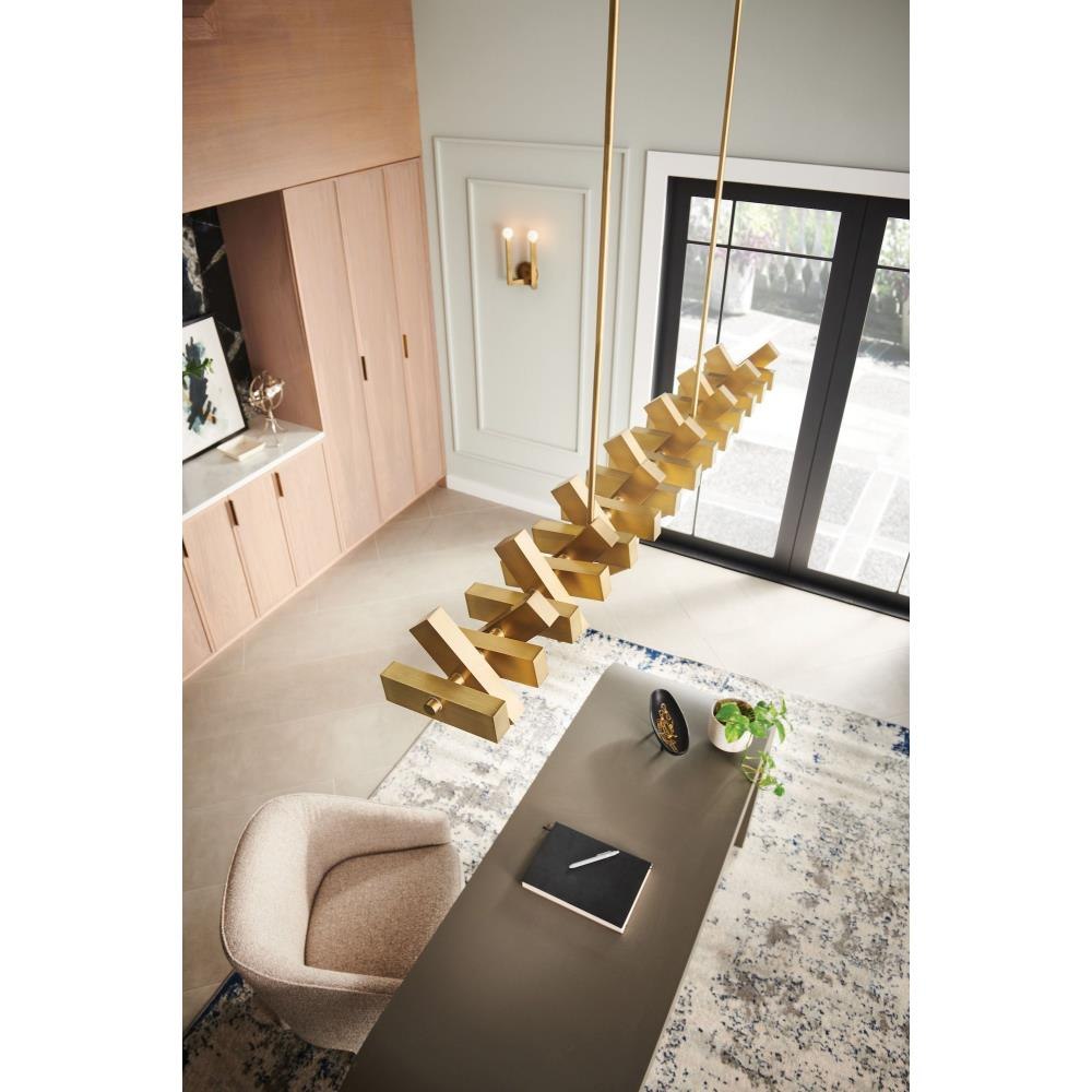 Stitch strikes a pose with an innovative design, offering bountiful illumination from articulating LED panels. This dynamic linear chandelier is a modern sculptural statement available in Black Oxide or Lacquered Brass finishes.