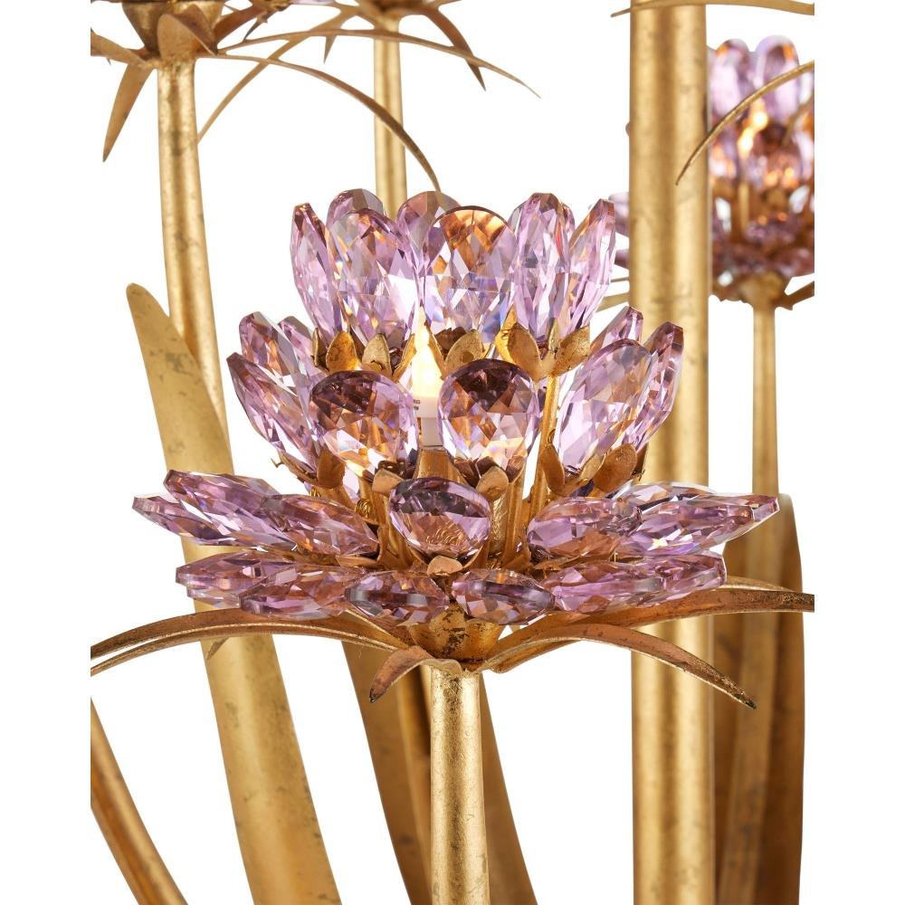 The Marilee Large Chandelier takes inspiration from floral forms, with graceful arms in a Dutch Gold Leaf finish adorned with flowing, leaf-like details. Each curved rod ends in a crystal blossom that encircles a bulb, creating a soft, glowing effect when illuminated. Subtle palm-shaped accents at the top and beneath each blossom add sculptural refinement, making this chandelier a study in delicate craftsmanship and organic elegance. Adjustable from 39" to 107" with use of included chain/rod kit/cable. If your space calls for a longer drop, additional chain/rods/cable is available for purchase.
