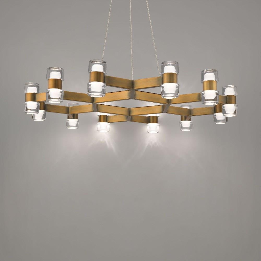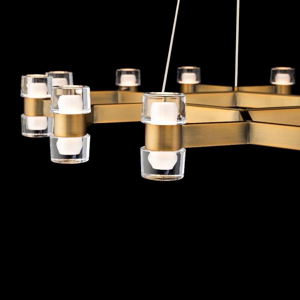 Twelve crystal rods, paired in twos and held by figure-eight brackets, move like dancers weaving in and out to form a graceful circular pattern. The brilliant Dashe pendant sparkles from crystal shards catch the light with every turn, while the sculptural metal adds an industrial edge, creating a harmonious blend of elegance and modern design. This 36-inch LED luminaire casts a warm 3000K illumination and is available in aged brass or black finishes.