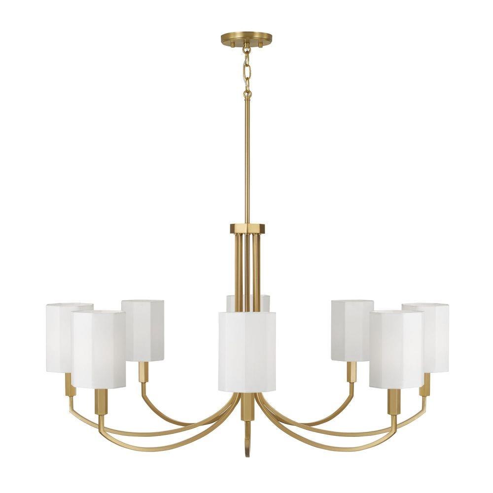 Geometrically inspired, the Adrian Large Chandelier brings a structural silhouette with high style. The White fabric octagonal shades and faceted candle sleeves create striking dimension, while the Aged Brass finish adds a classic touch.