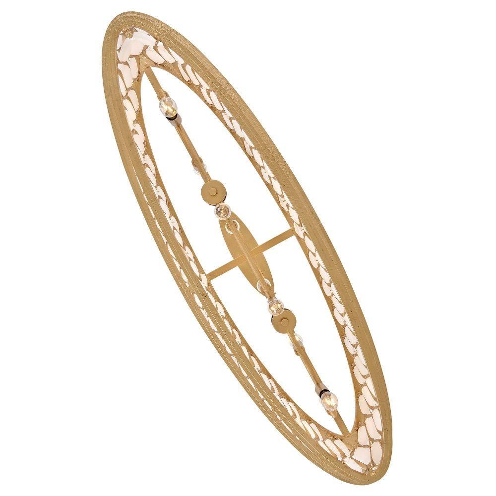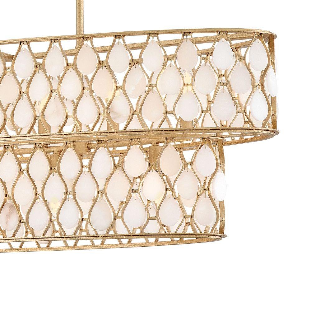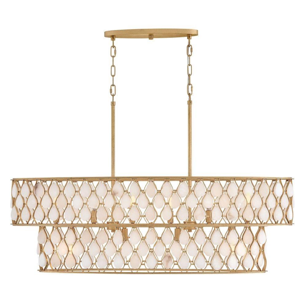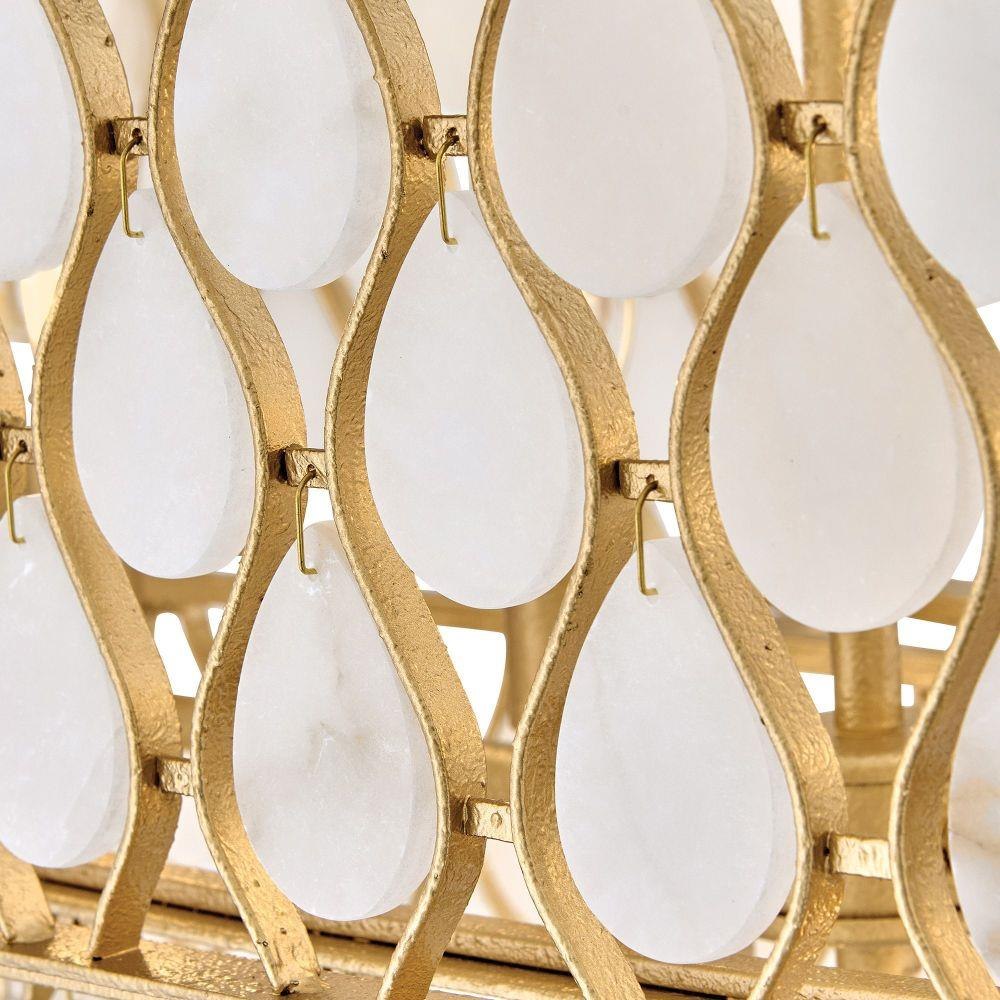 Opulently adorned with natural alabaster stones held within a traditional latticework shade, Estie brings organic elegance to any décor aesthetic. Intricately curved metalwork complements the frame, chain, and canopy in a textured, hand-painted Piastra Gold finish