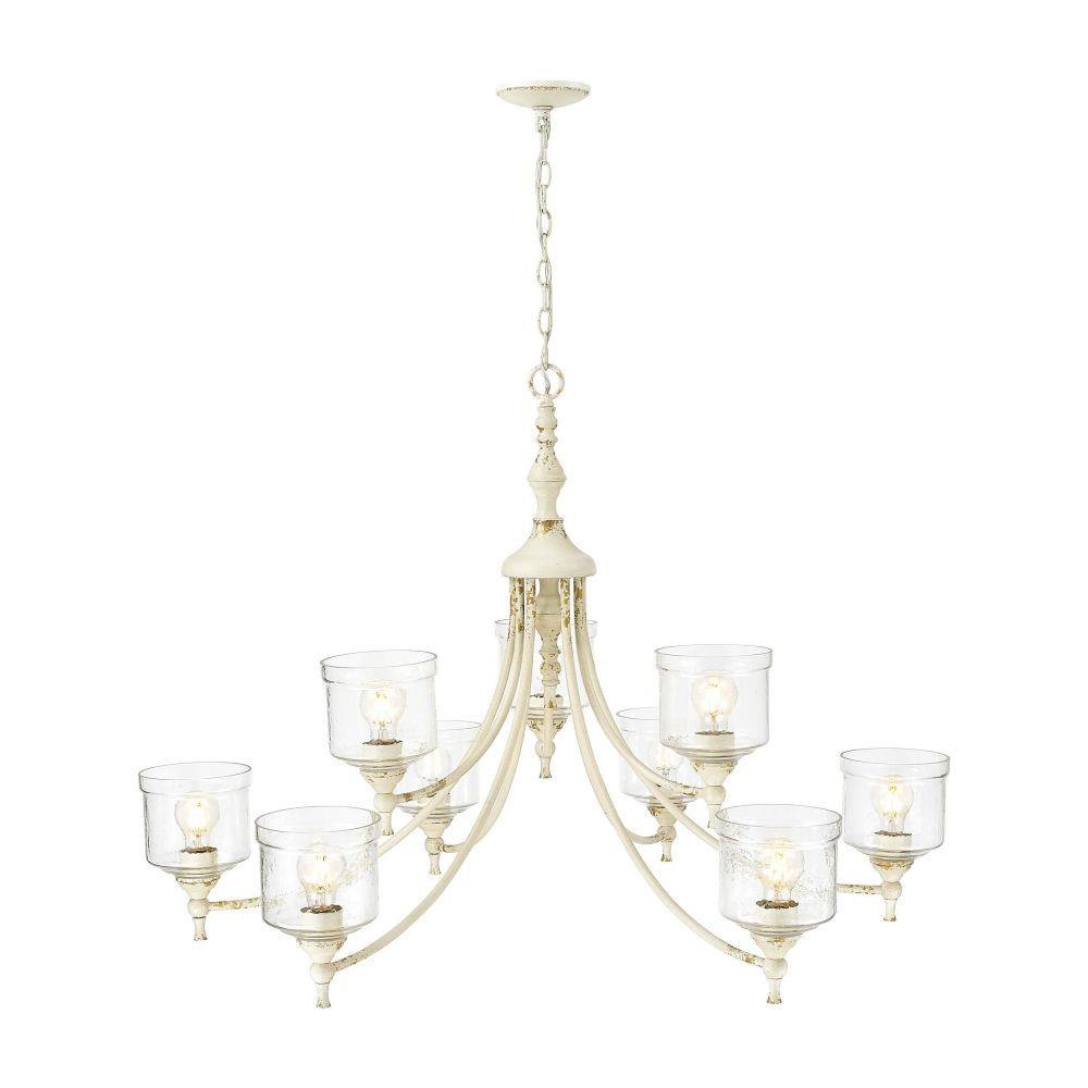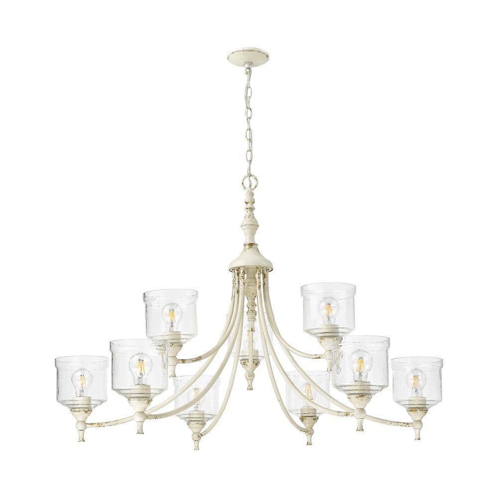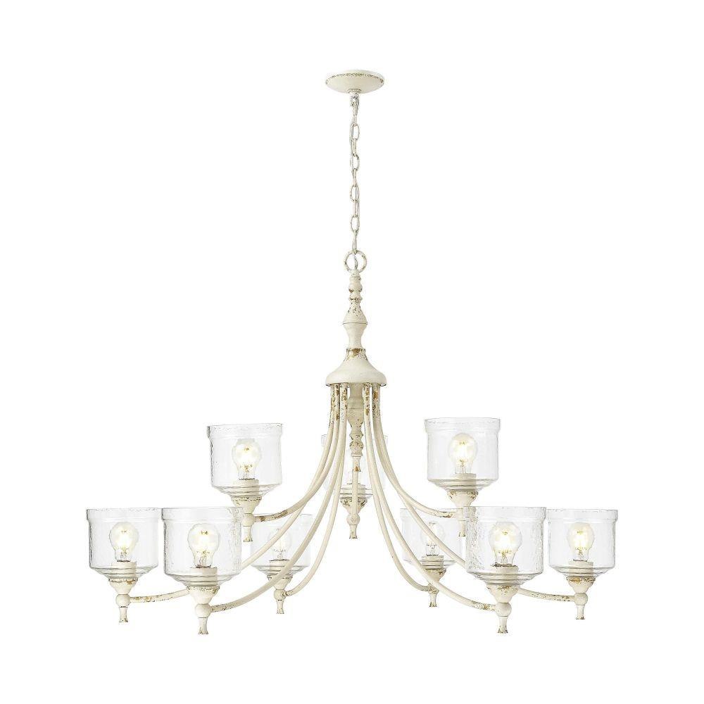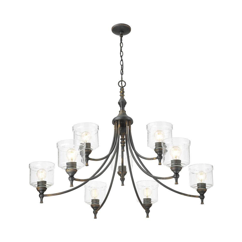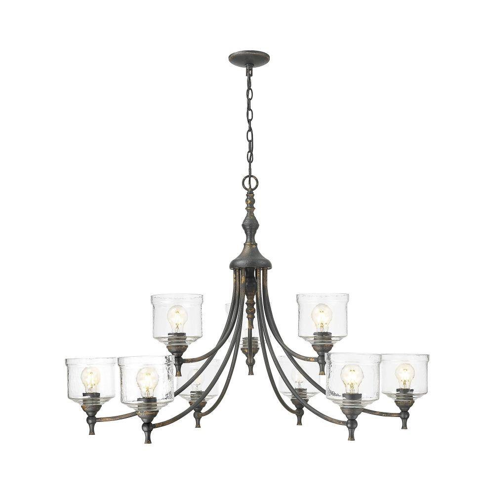 Bring rustic elegance into your home with the Golden Lighting Keating 9-light Chandelier. Featuring a glass shade and an Antique Black Iron frame, it creates a welcoming atmosphere.The chandelier showcases a stunning hammered water glass shade, which features an organic texture that beautifully refracts light. This artisanal choice adds a touch of dramatic elegance to any space, catching and reflecting light in captivating patterns.Capture the raw, authentic charm of the Antique Black Iron finish, a deeply textured surface that tells a story of time and endurance. This rugged finish is perfect for industrial, rustic, and farmhouse designs, making a powerful statement in any room.Ideal for dining rooms, foyers, or living spaces, this chandelier is rated for dry locations, ensuring safety indoors. It is also sloped-ceiling compatible and features an adjustable height, allowing for effortless customization in your space.Overall Dimensions: 44"W x 29.75"H x 44"D. Requires 9 E26 Medium base bulbs (not included), with a maximum wattage of 60 per bulb.Embrace the artisanal craftsmanship and timeless quality that this chandelier adds to your home, creating a cozy and inviting ambiance.