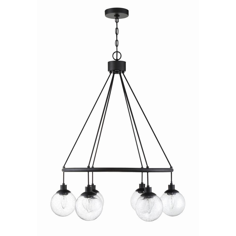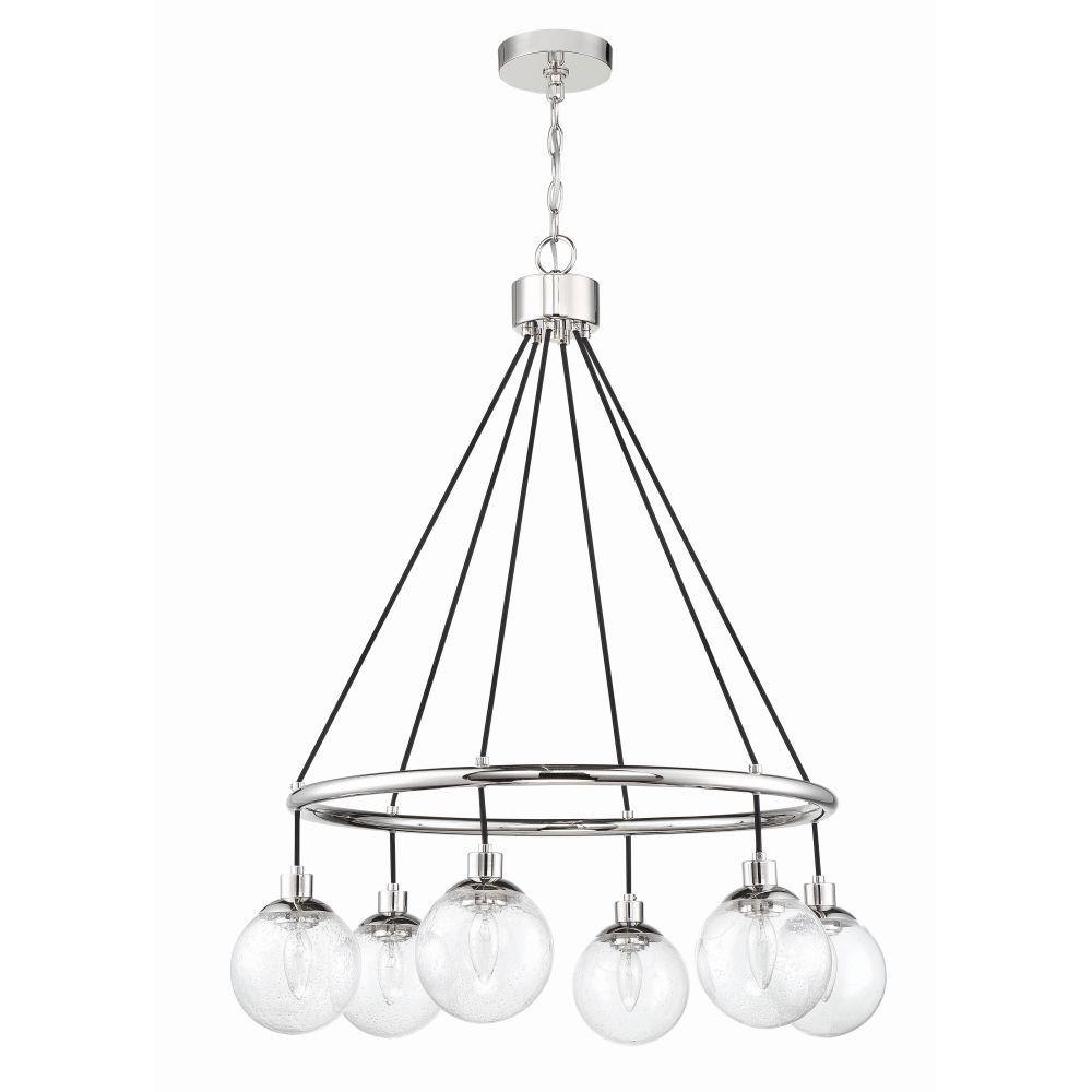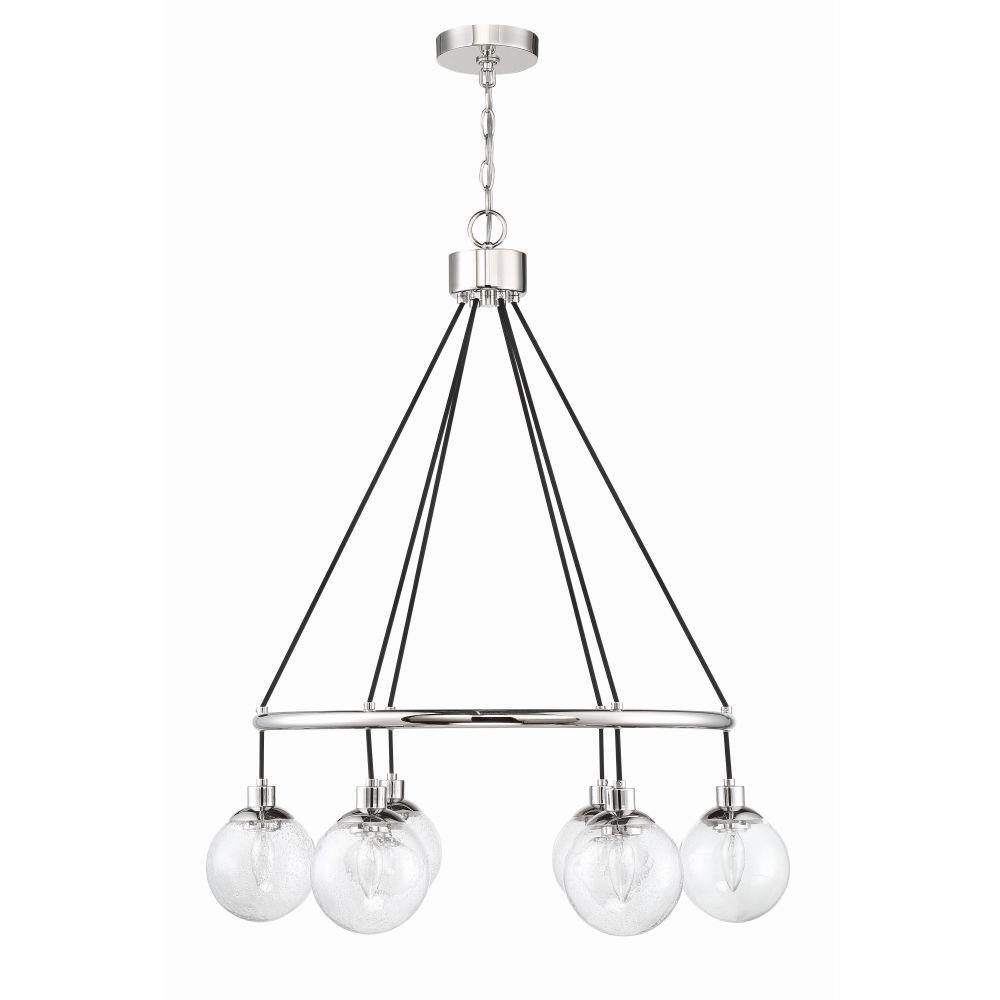 Make a statement with the striking silhouettes of the Que collection. Clear seeded glass globes in updated silhouettes offer a fresh look to brighten your home.Clear Seeded Glass Shades (included)Requires 6 Candelabra base, 40 watt bulbs (not incl