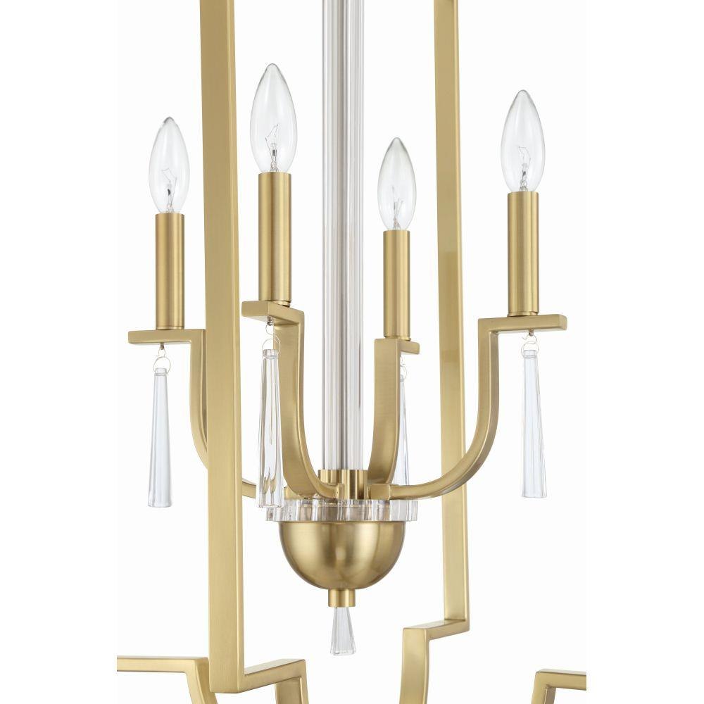 The Fortuna Lighting Collection by Craftmade with optional classic white mini drum shades, satin brass candle sleeves and crystal accents delivers understated elegance and inviting warmth.